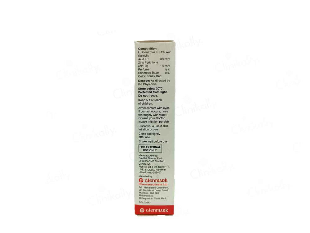 It contains three active ingredients, Luliconazole, Zinc pyrithione, and Salicylic acid, which collectively target dandruff-causing fungi, inhibit fungal growth, and remove dead skin cells.