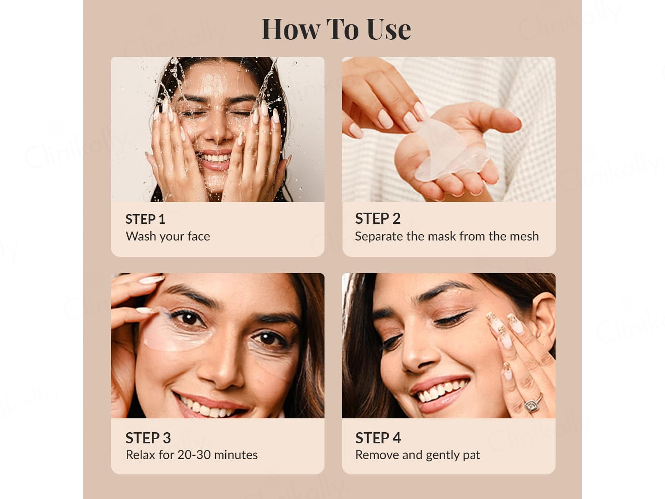 - Remove the LuxaDerme Under Eye Revive Bio Cellulose Sheet Mask and massage the excess serum into the skin without rinsing.