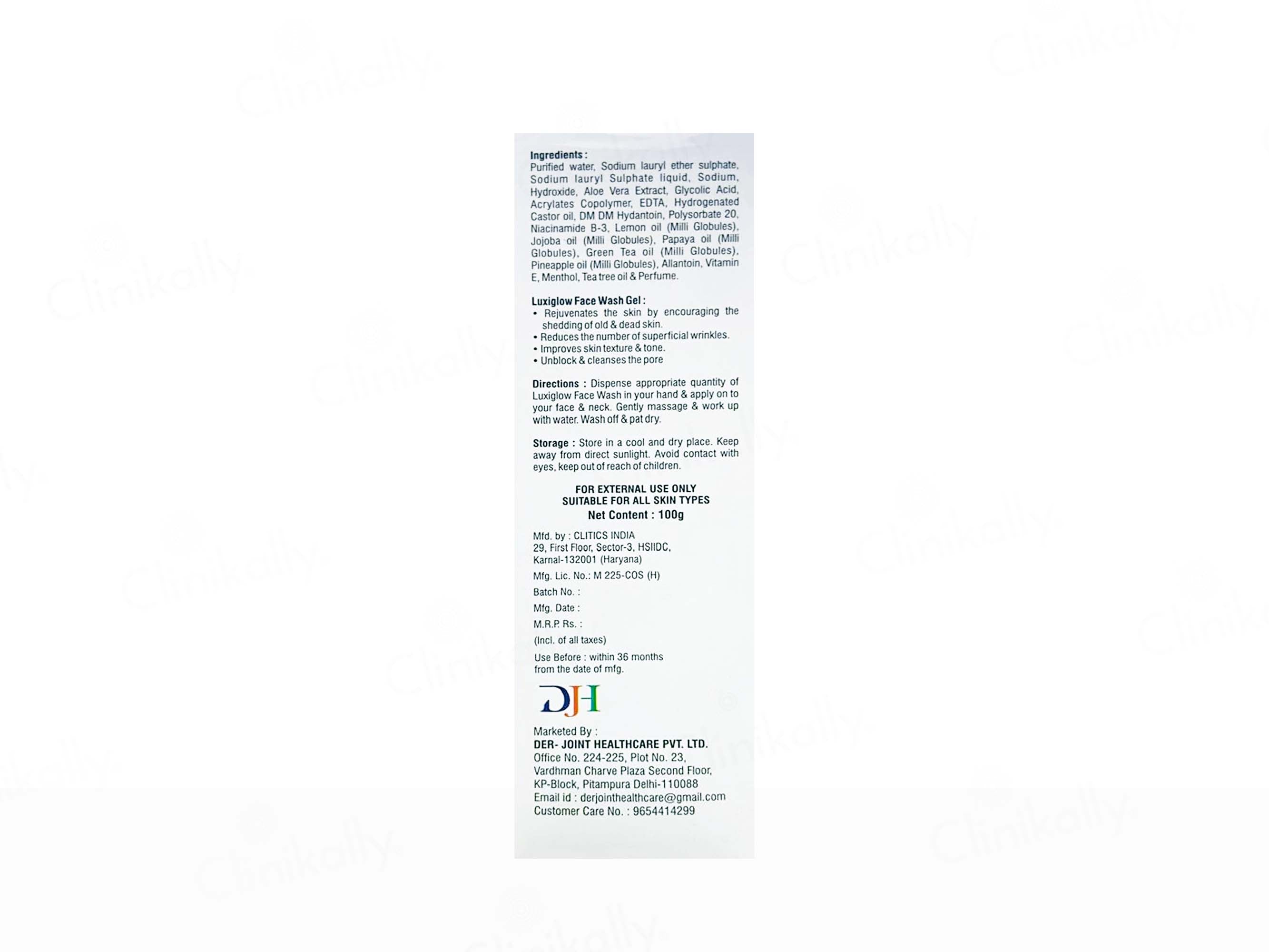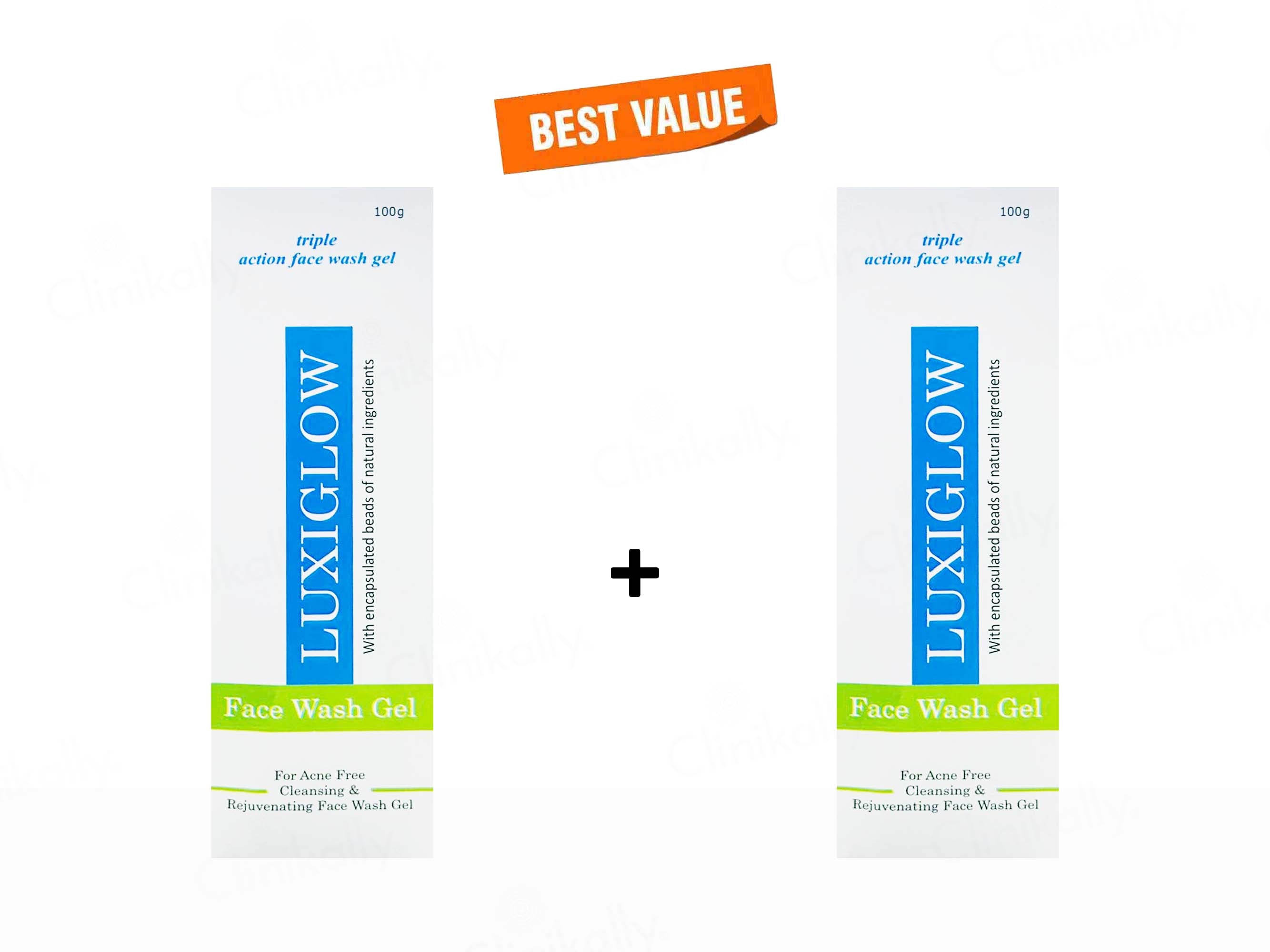 Luxiglow Triple Action Face Wash Gel contains gentle exfoliating agents that promote the shedding of old and dead skin cells, leading to skin rejuvenation. It also reduces the appearance of superficial wrinkles through its skin-smoothing properties. Additionally, it enhances skin texture and tone by encouraging healthy skin cell turnover. The formula effectively unblocks and cleanses pores, resulting in clearer and more radiant skin.