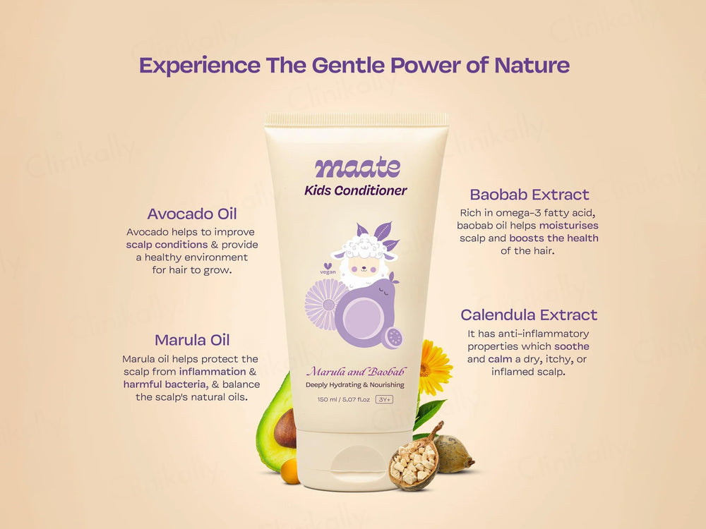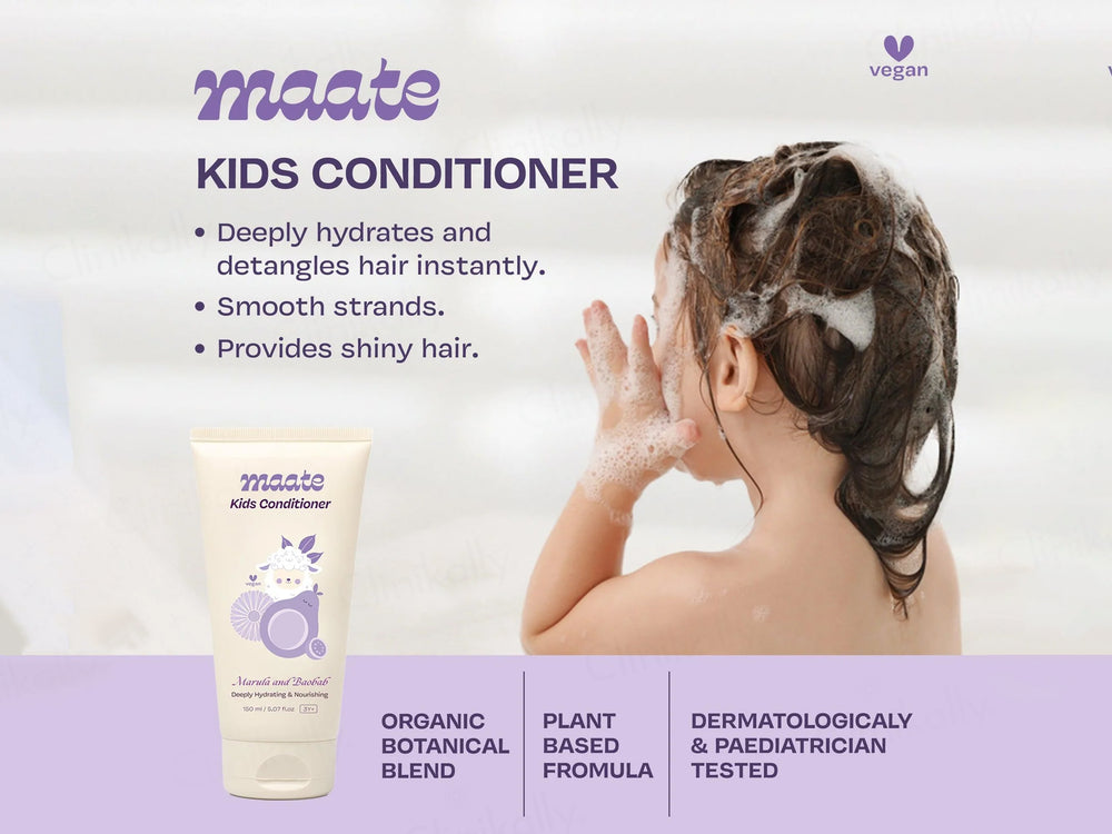 Maate Marula and Baobab Kids Hair Conditioner is used to hydrate, nourish, and improve the manageability of kids' hair.