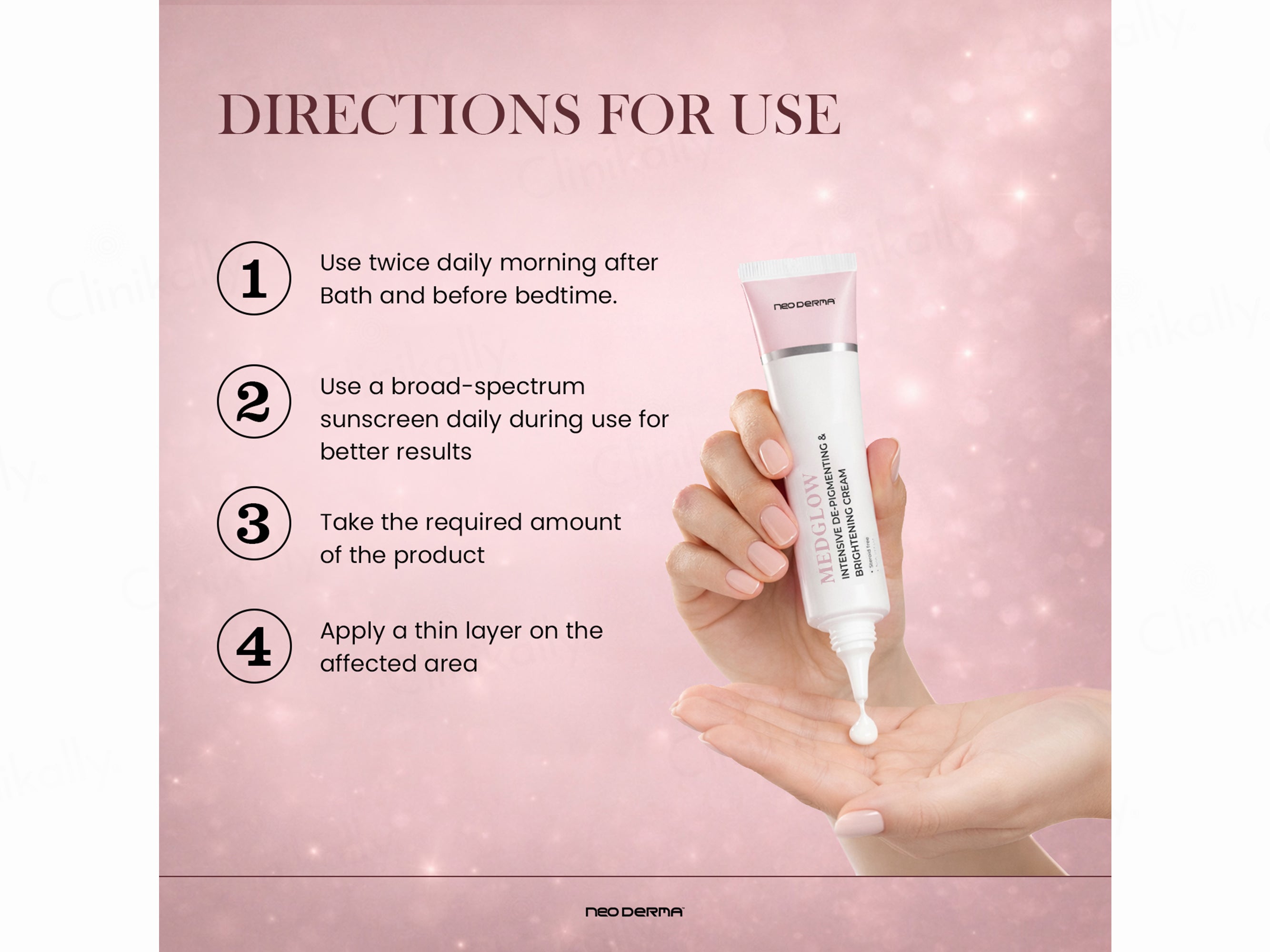 • Apply the required amount of Medglow Intensive De-Pigmenting & Brightening Cream on affected areas twice daily or as recommended; use sunscreen during daytime for best results.