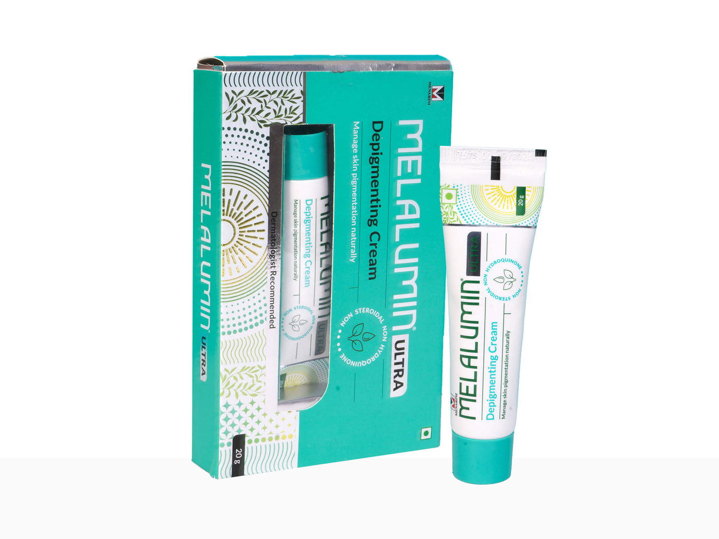 Melalumin Ultra Depigmenting Cream targets excess melanin production, reducing the visibility of dark spots, melasma, and other forms of hyperpigmentation.