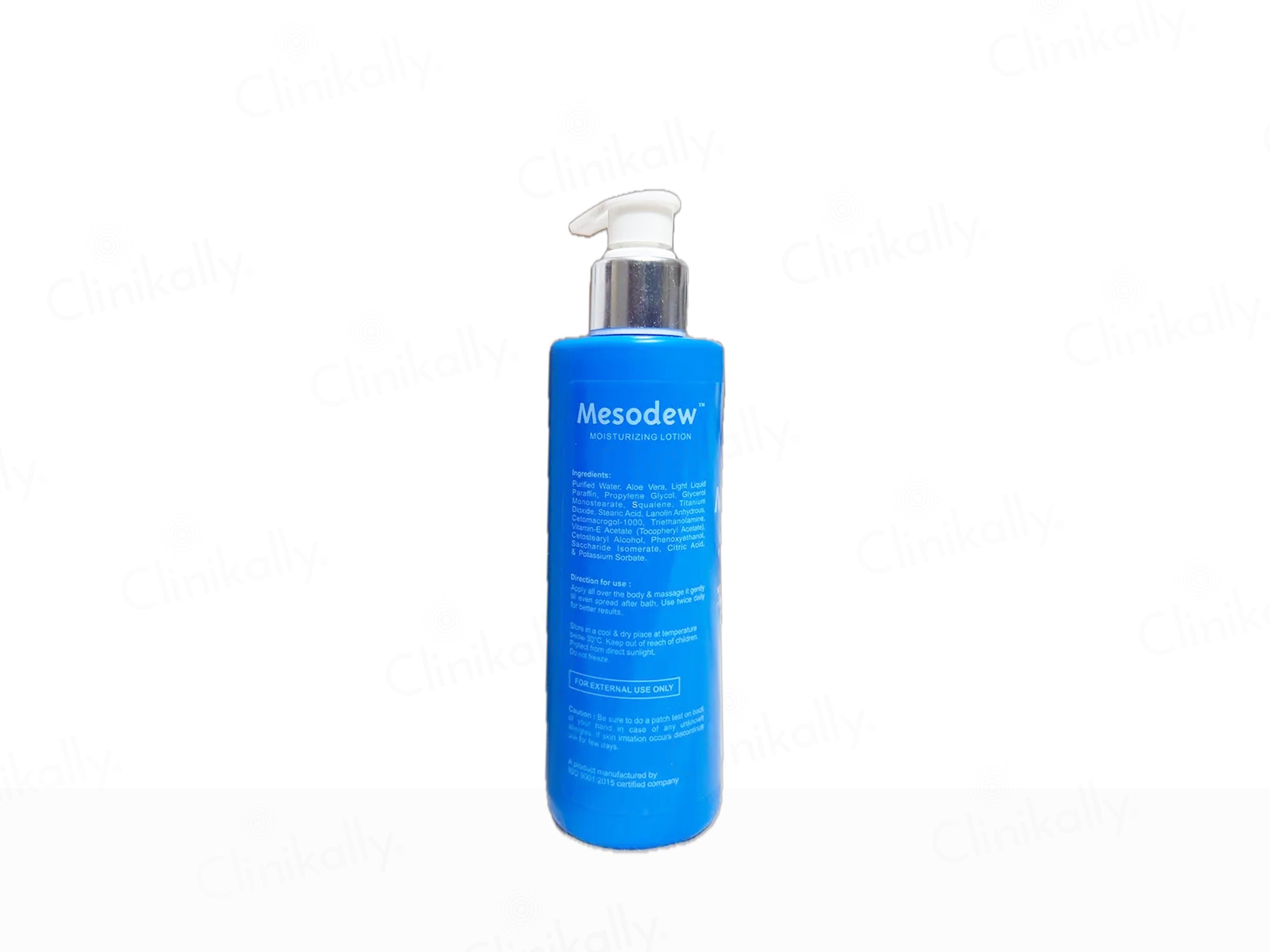 Mesodew Moisturizing Lotion contains Aloe Vera, Vitamin E, Squalene, and other moisturizing ingredients.