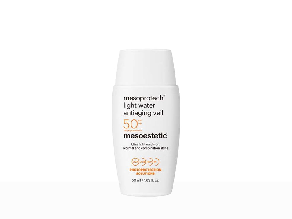 Mesoestetic Mesoprotech Water Veil Ultra-Light Gel Cream Sunscreen SPF 50+ is a lightweight sunscreen for oily and combination skin, offering high UVA, UVB, and IR-HEV protection with a non-greasy finish.