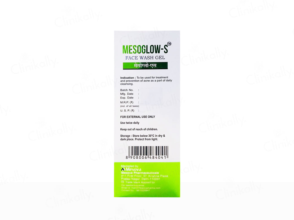 Mesoglow-S Face Wash Gel contains Salicylic Acid, Glycolic Acid, Aloe Vera, Tea Tree Oil, and Vitamin E.