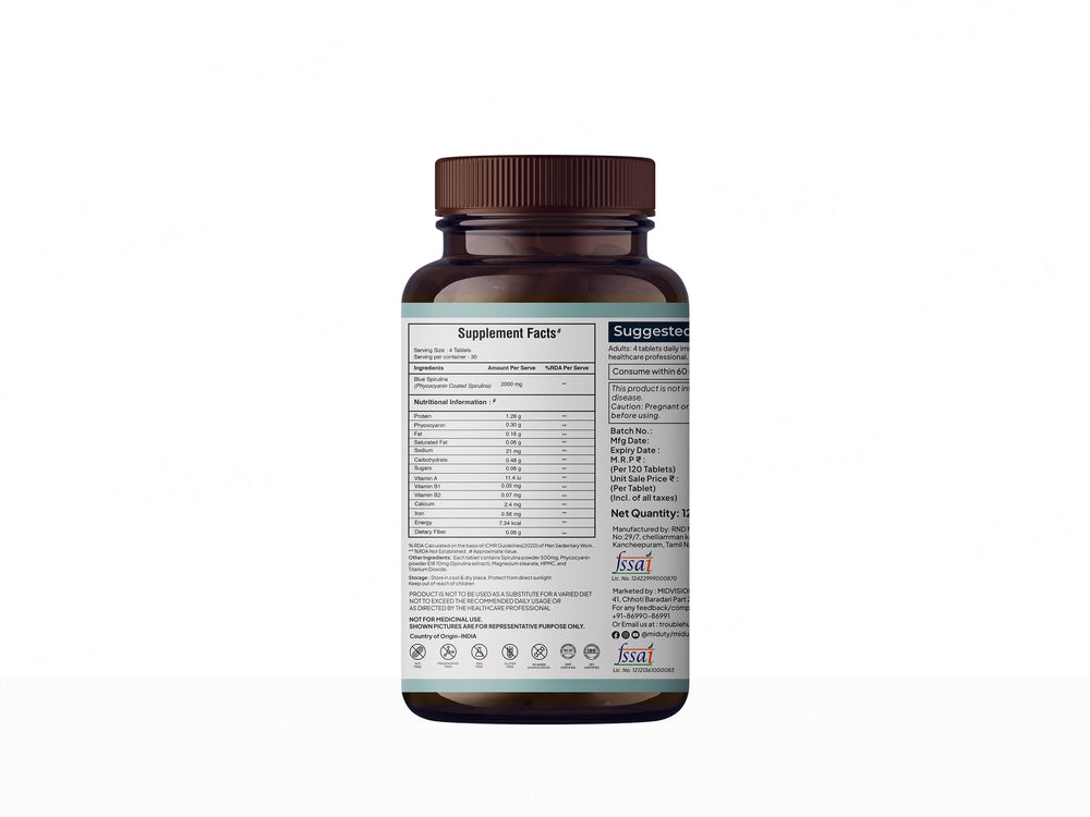Miduty Blue Spirulina + PeakATP® With Phycocyanin Coating Tablet is a vibrant superfood supplement packed with antioxidant power. Featuring Blue Spirulina (Phycocyanin Coated Spirulina) & PeakATP® (Adenosine 5'-Triphosphate), it delivers a potent dose of phycocyanin, known for its anti-inflammatory and immune-boosting properties. This tablet supports detoxification, enhances energy, and promotes overall wellness with its rich nutrient profile. Ideal for those seeking a natural way to boost vitality, it’s a convenient addition to your daily routine, offering the benefits of spirulina in a concentrated, easy-to-take form.