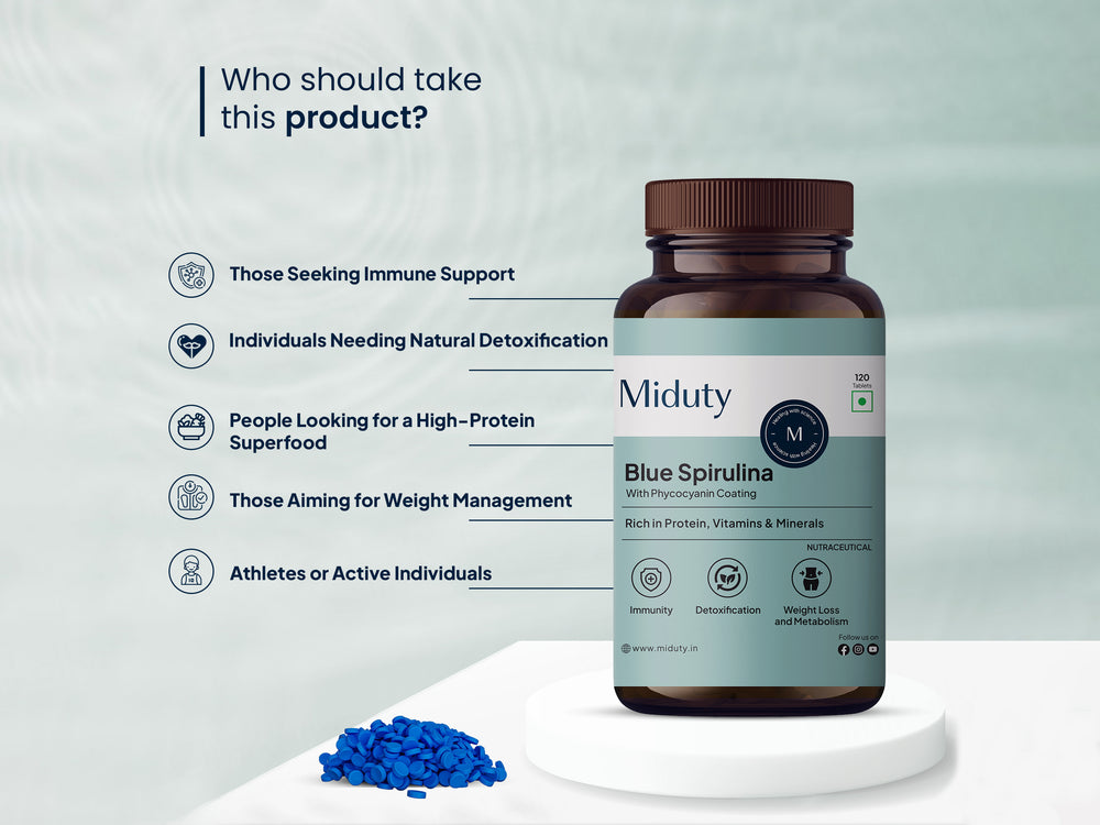 • Supports Digestive Health: Miduty’s Blue Spirulina tablets are enriched with natural fiber and bioactive compounds that helps digestive health and gut flora. With the gentle formulation, these tablets may support daily gut wellness.