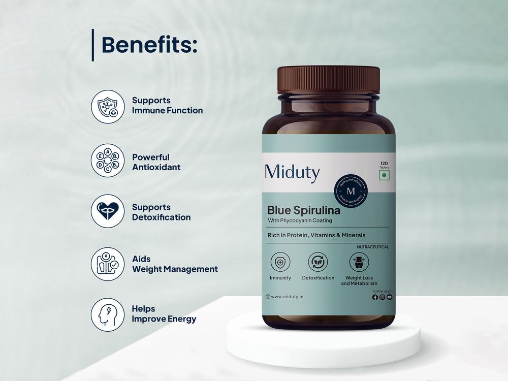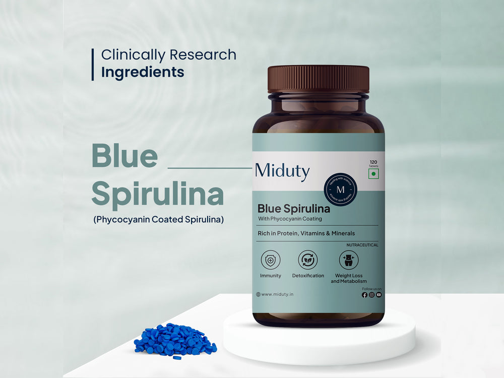 Miduty Blue Spirulina + PeakATP® With Phycocyanin Coating Tablet is a superfood supplement with Blue Spirulina to boost immunity and support detoxification.