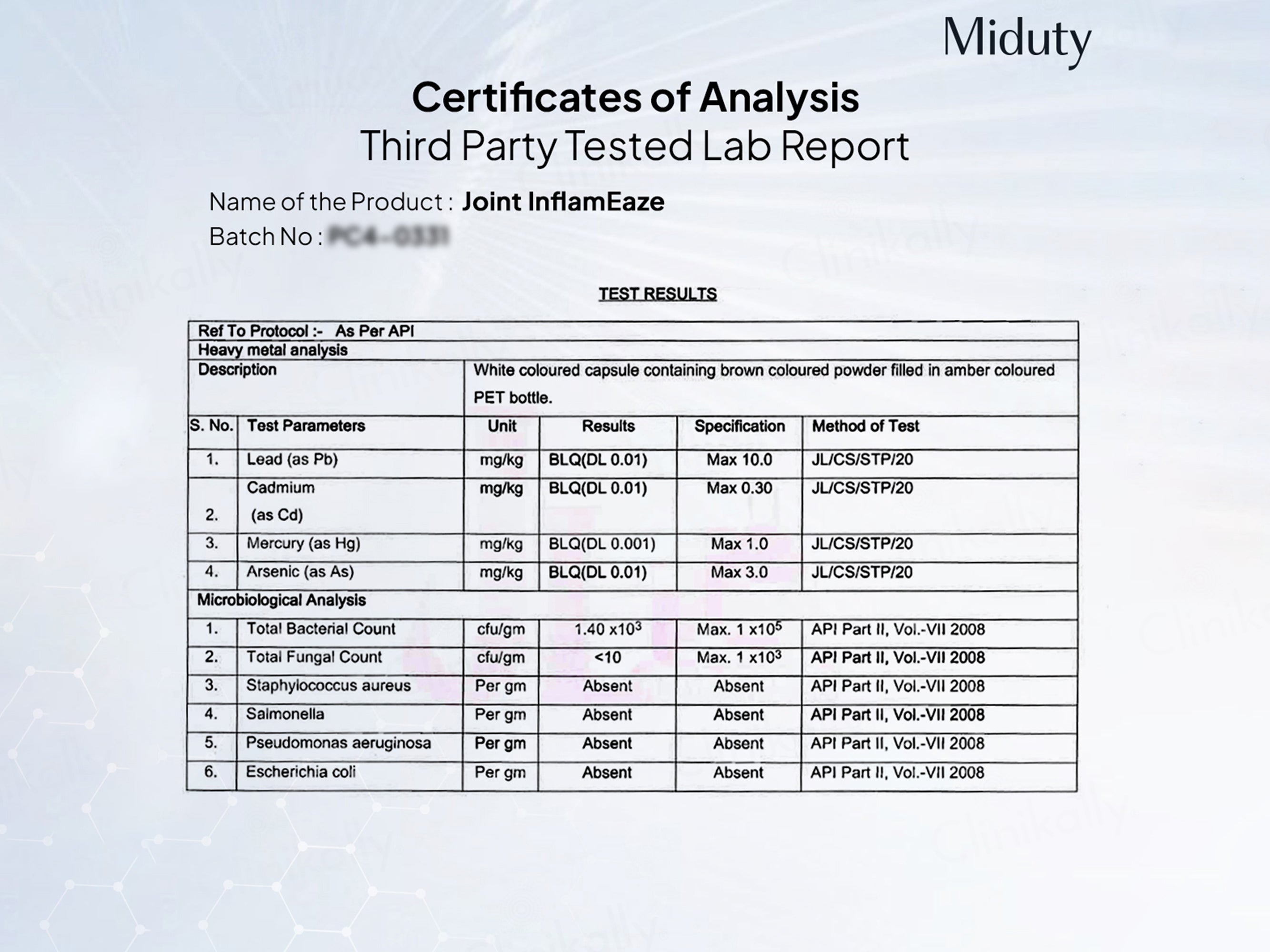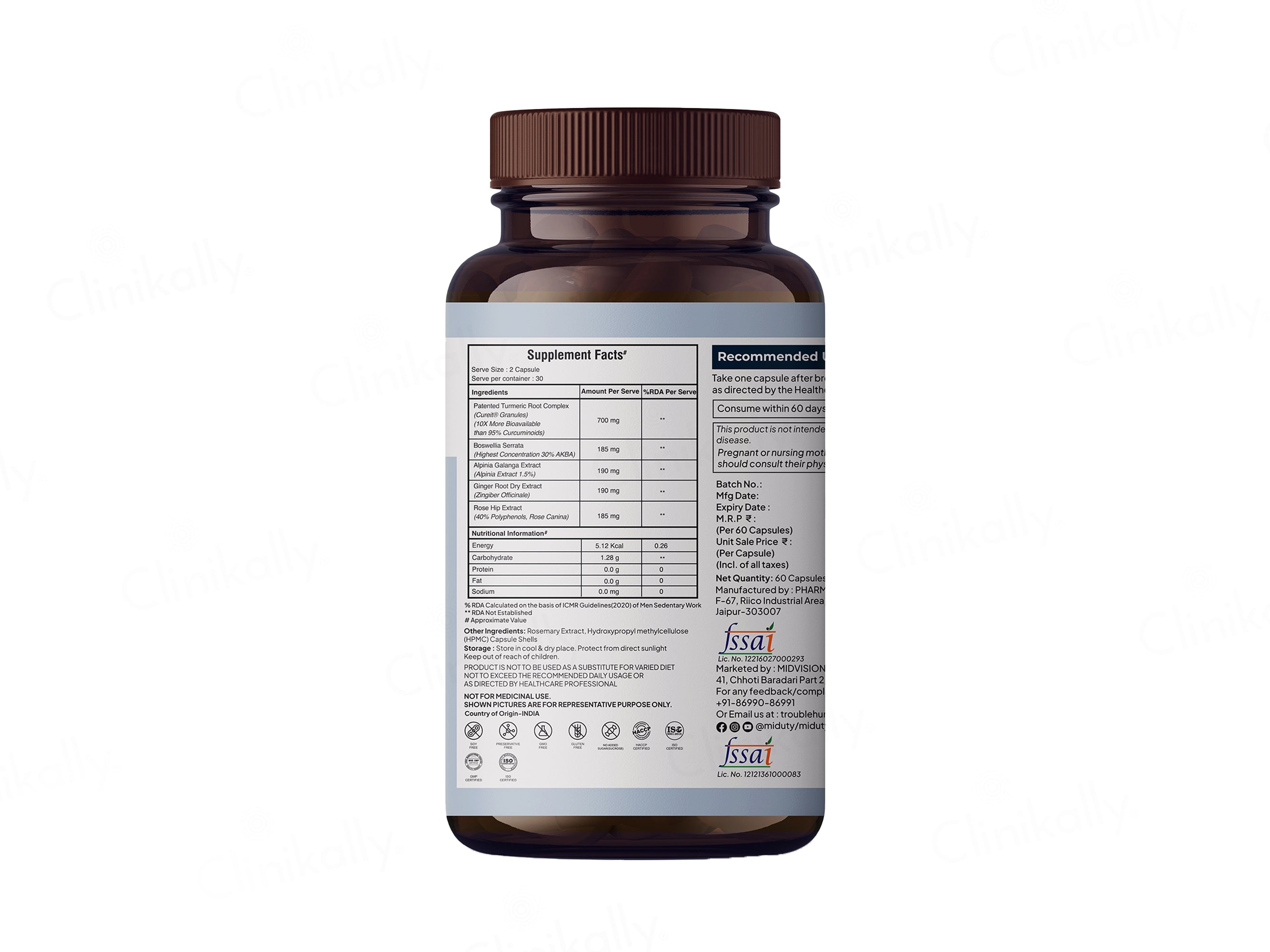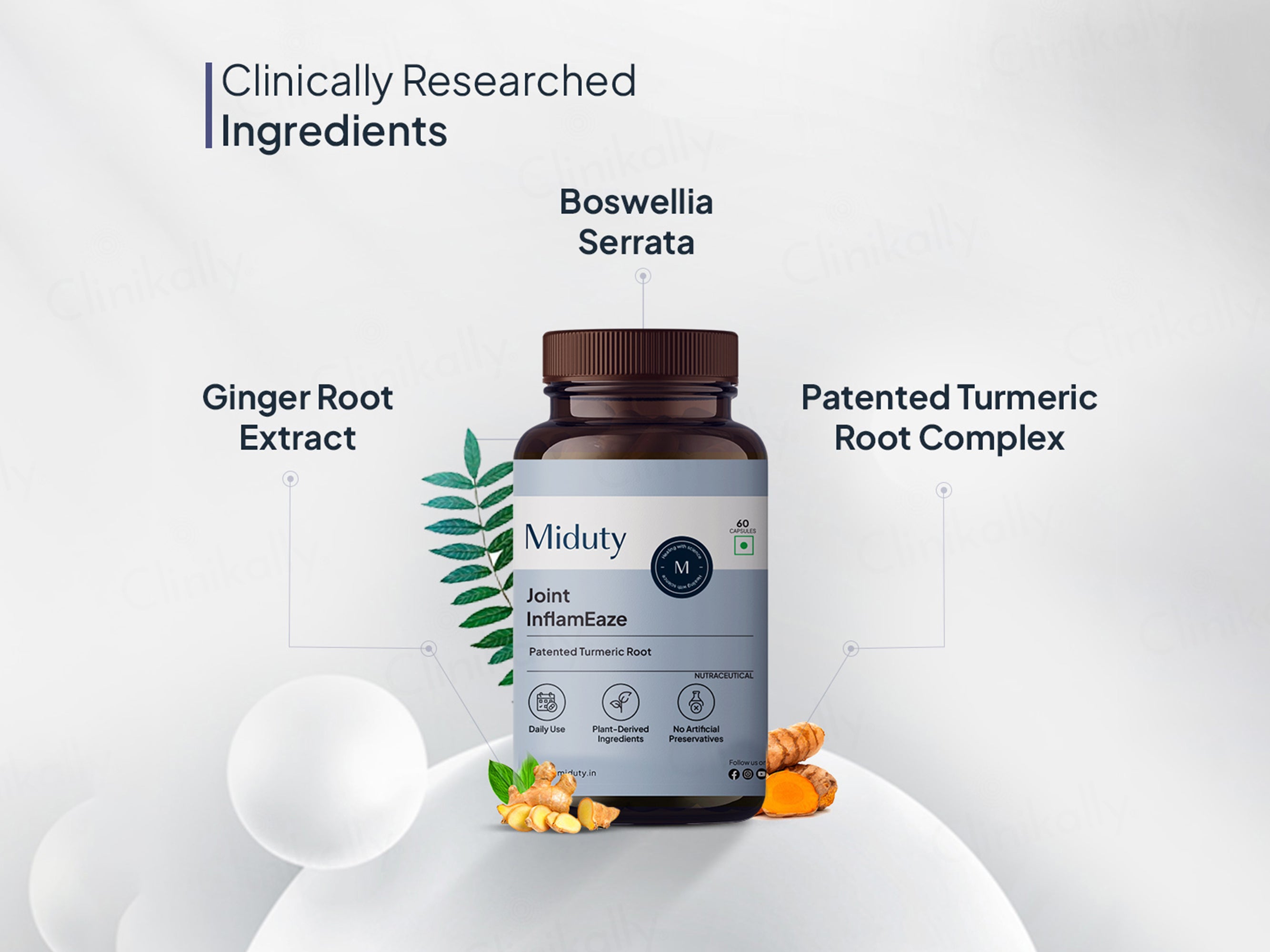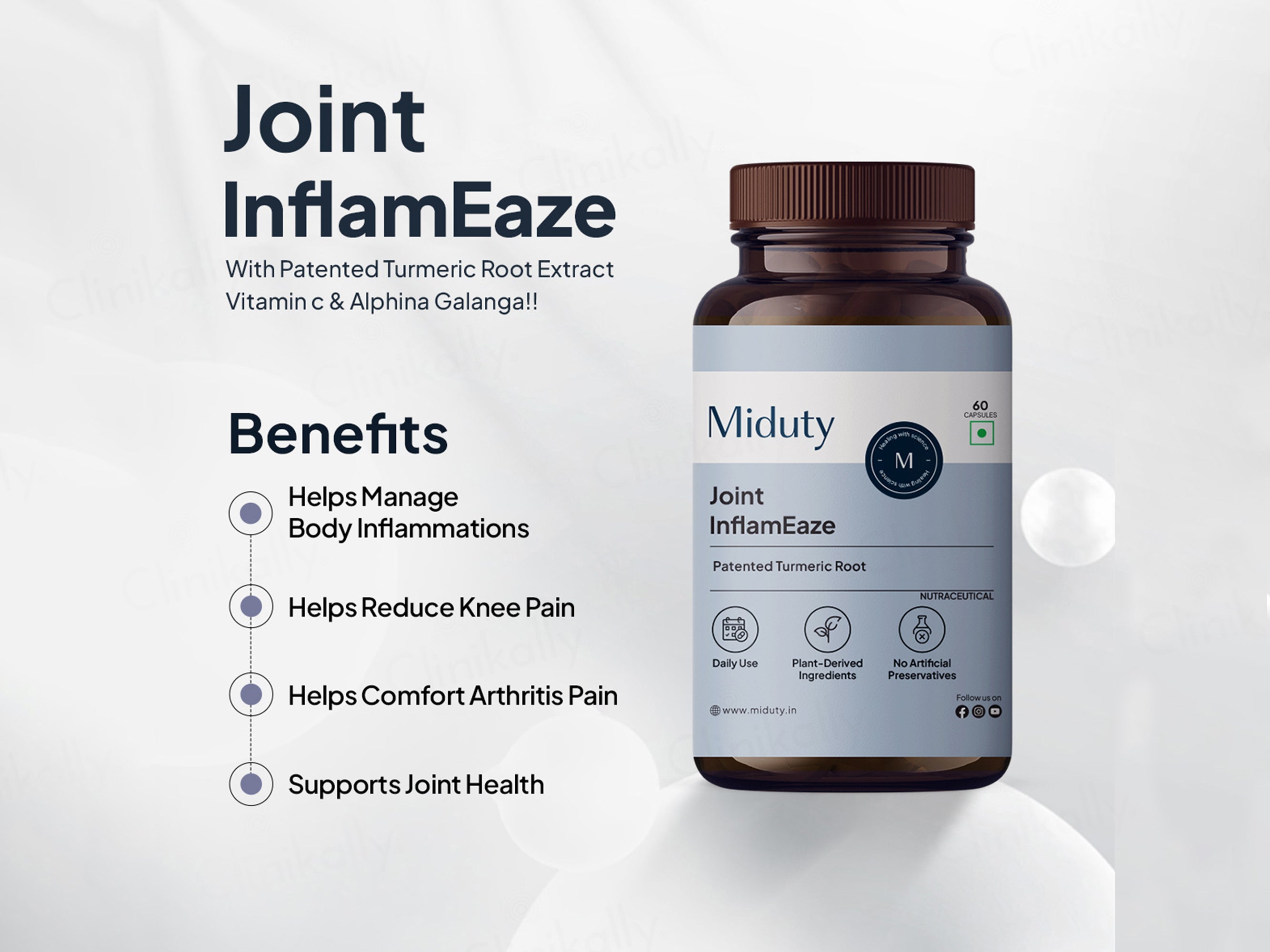 Miduty Joint InflamEaze Capsule is a natural supplement designed to reduce joint pain and support mobility with Turmeric and Boswellia.