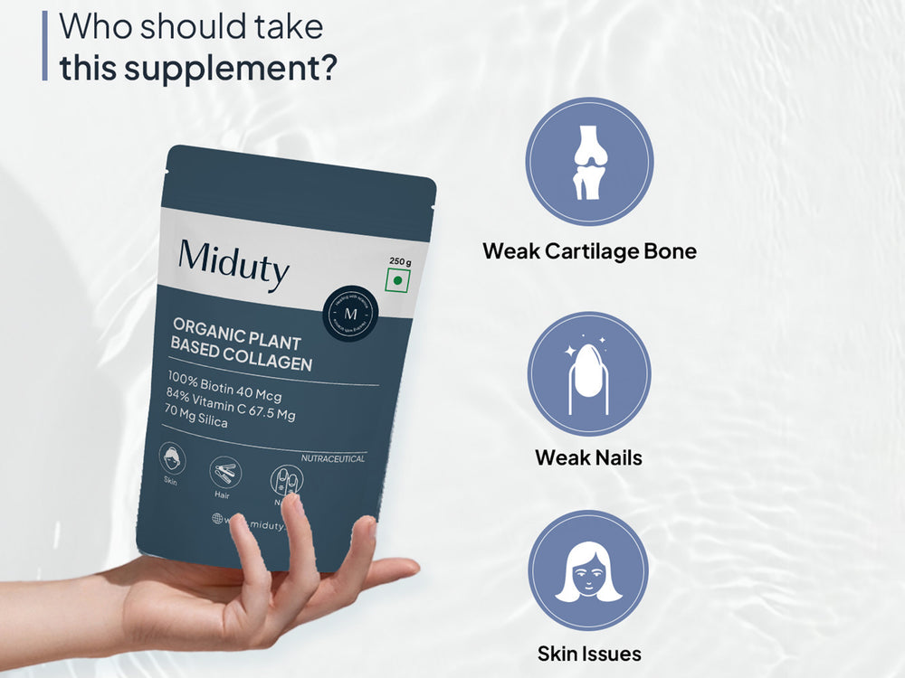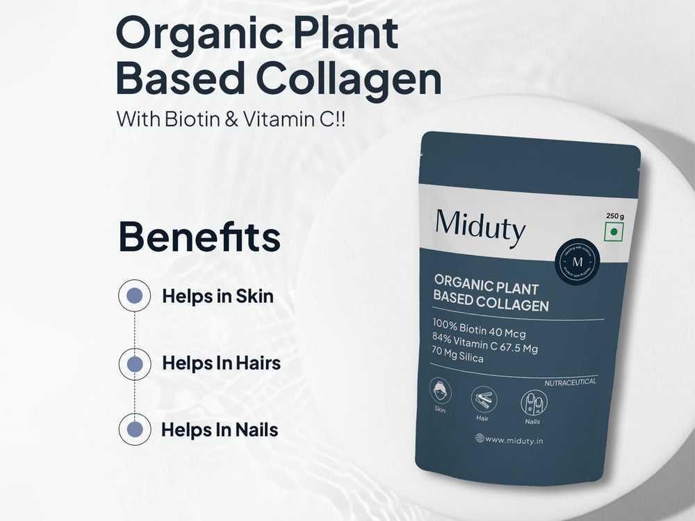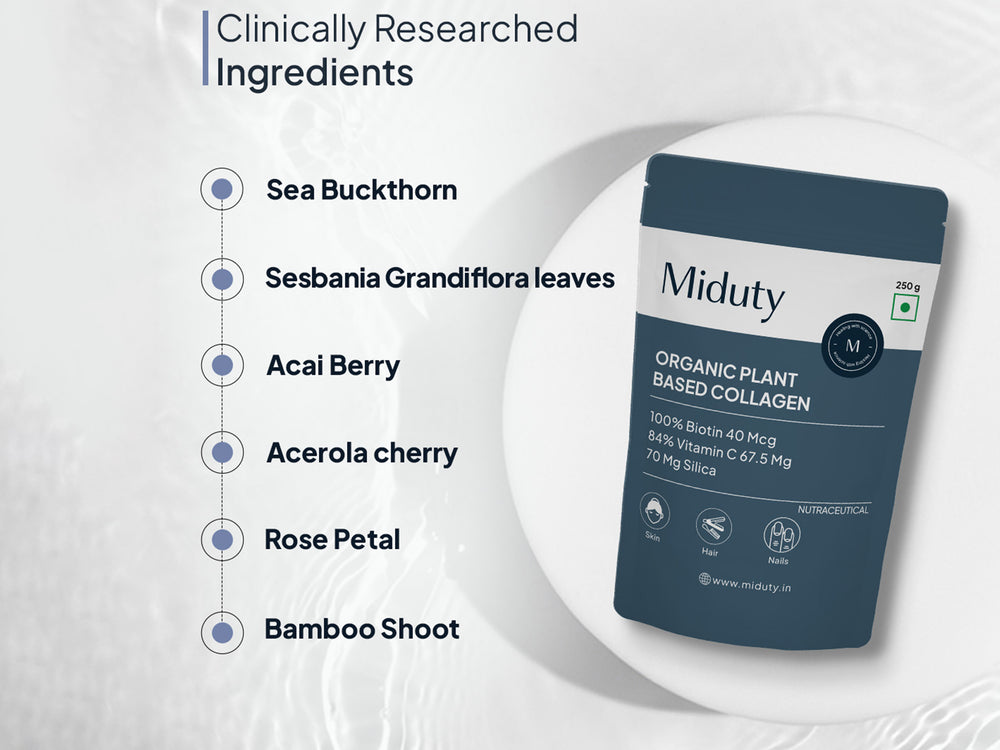 Miduty Plant-Based Collagen Builder Nutraceutical Powder is a vegan-friendly supplement designed to support skin, hair, and joint health. Featuring a blend of Sea Buckthorn, Sesbania Grandiflora Leaves, Acai Berry, Acerola Cherry, Rose Petal, and Bamboo Shoot, it provides plant-based nutrients to boost collagen production naturally. This powder enhances skin elasticity, strengthens hair, and supports joint flexibility while delivering antioxidant benefits. Ideal for those seeking a plant-based alternative to collagen, it promotes overall beauty and wellness with every scoop.