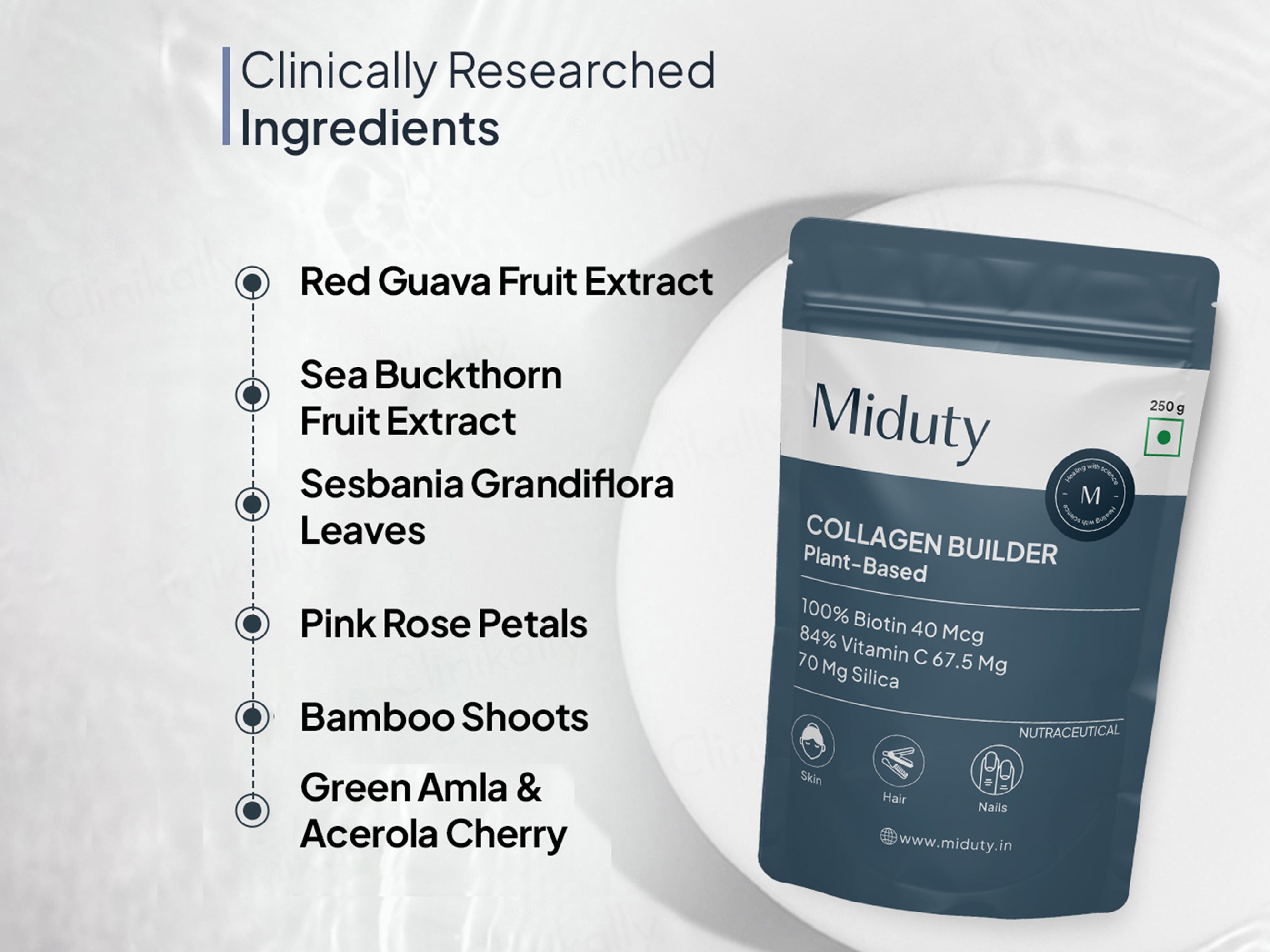 Miduty Plant-Based Collagen Builder Nutraceutical Powder is a vegan-friendly supplement designed to support skin, hair, and joint health. Featuring a blend of Sea Buckthorn, Sesbania Grandiflora Leaves, Acai Berry, Acerola Cherry, Rose Petal, and Bamboo Shoot, it provides plant-based nutrients to boost collagen production naturally. This powder enhances skin elasticity, strengthens hair, and supports joint flexibility while delivering antioxidant benefits. Ideal for those seeking a plant-based alternative to collagen, it promotes overall beauty and wellness with every scoop.