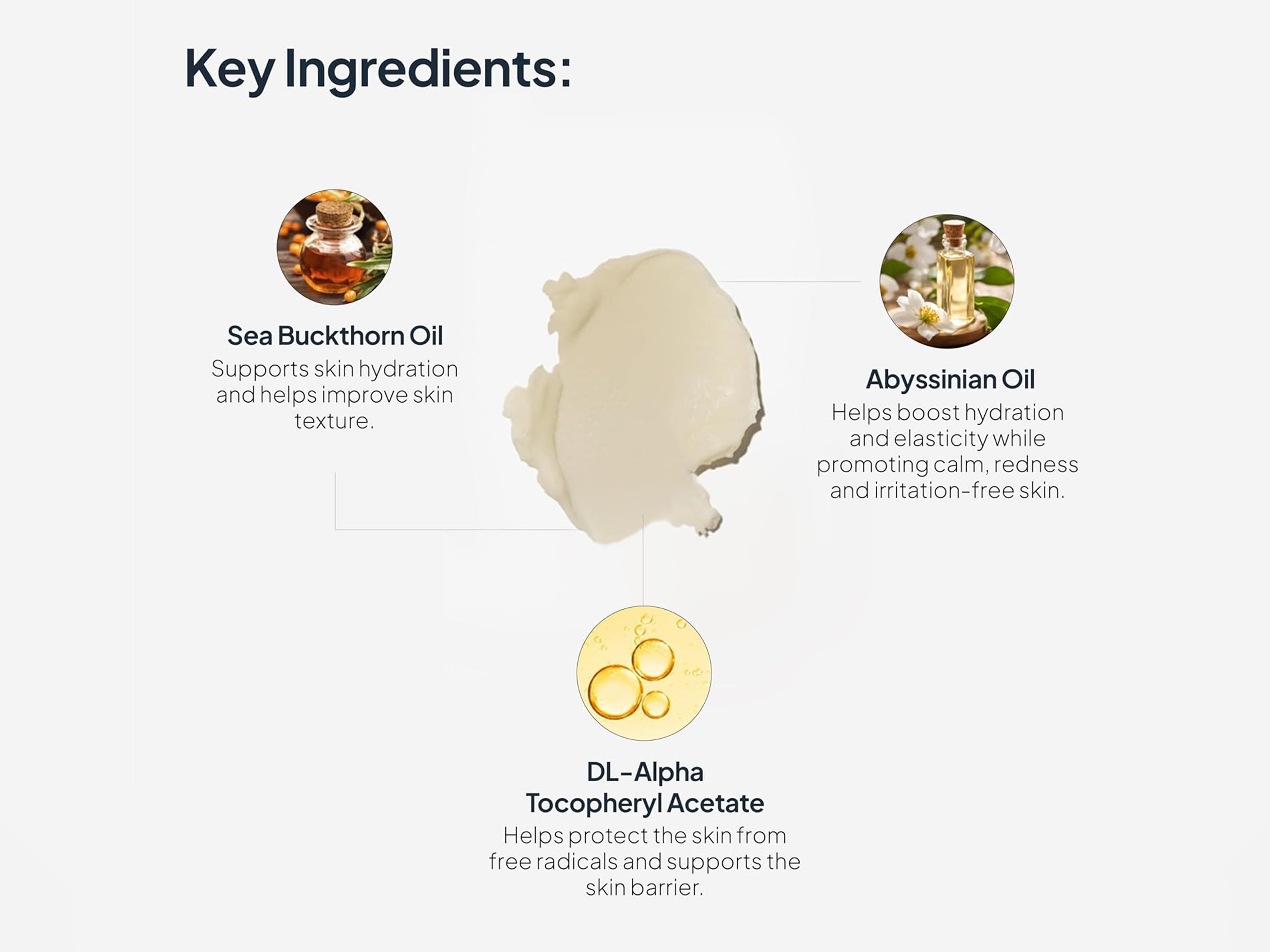 The key ingredients include Sea Buckthorn Oil, Abyssinian Oil, and DL-Alpha Tocopheryl Acetate which support hydration, calm irritation, and protect the skin barrier.