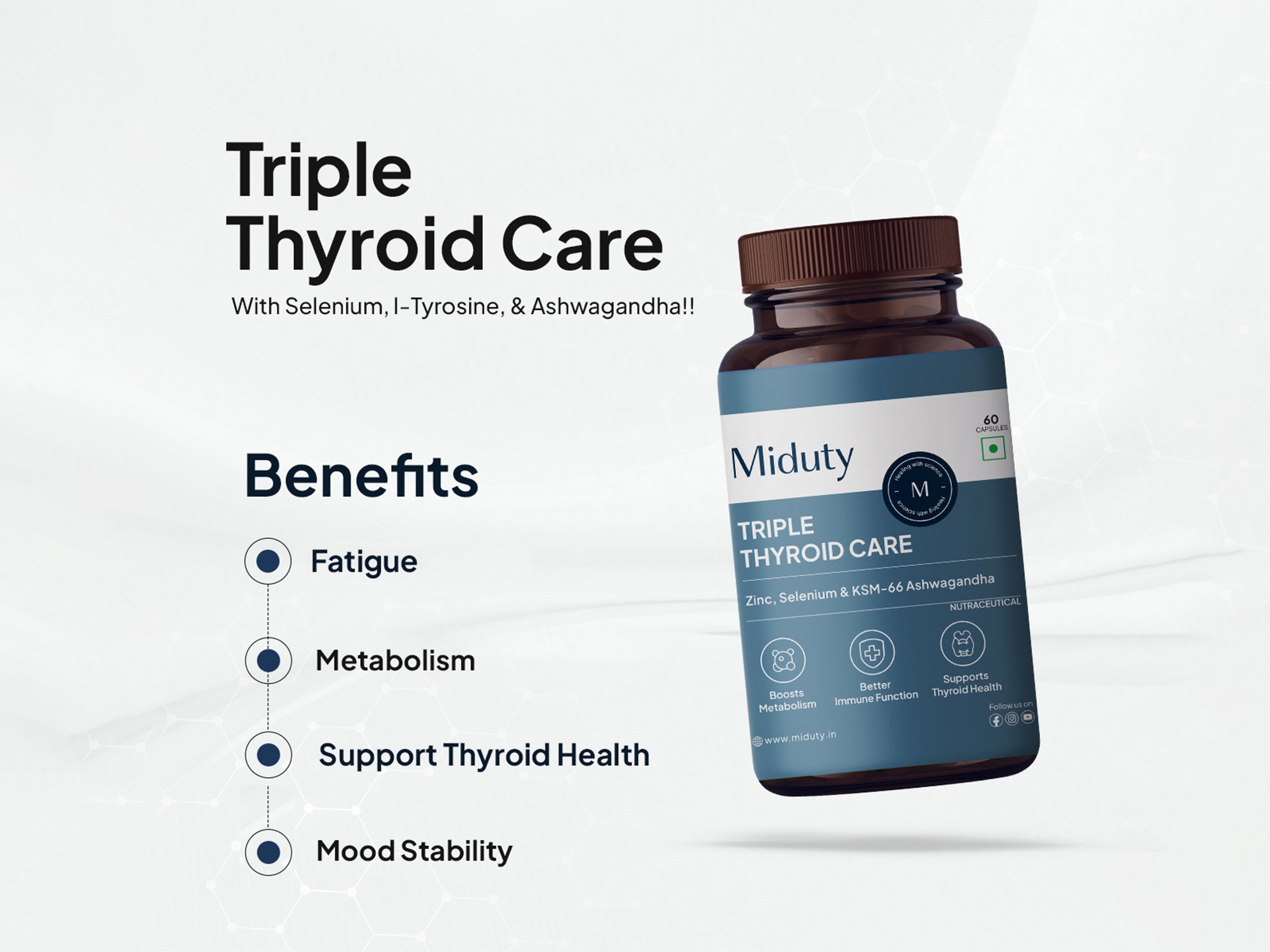 Miduty Thyroid Supplement Bundle is designed to support thyroid function, balance hormone levels, and improve energy and metabolism for those with thyroid imbalances. This bundle likely includes supplements such as Thyroid Support, Vitamin B12 (Methyl B12, Folate & B6), and Iodine Plus, which work together to regulate thyroid hormones, reduce fatigue, and enhance overall wellness. Featuring natural ingredients like Ashwagandha Extract, Selenium, and Iodine, it supports thyroid gland health, boosts metabolism, and addresses symptoms like weight gain or hair loss, making it ideal for managing hypothyroidism or hyperthyroidism naturally.