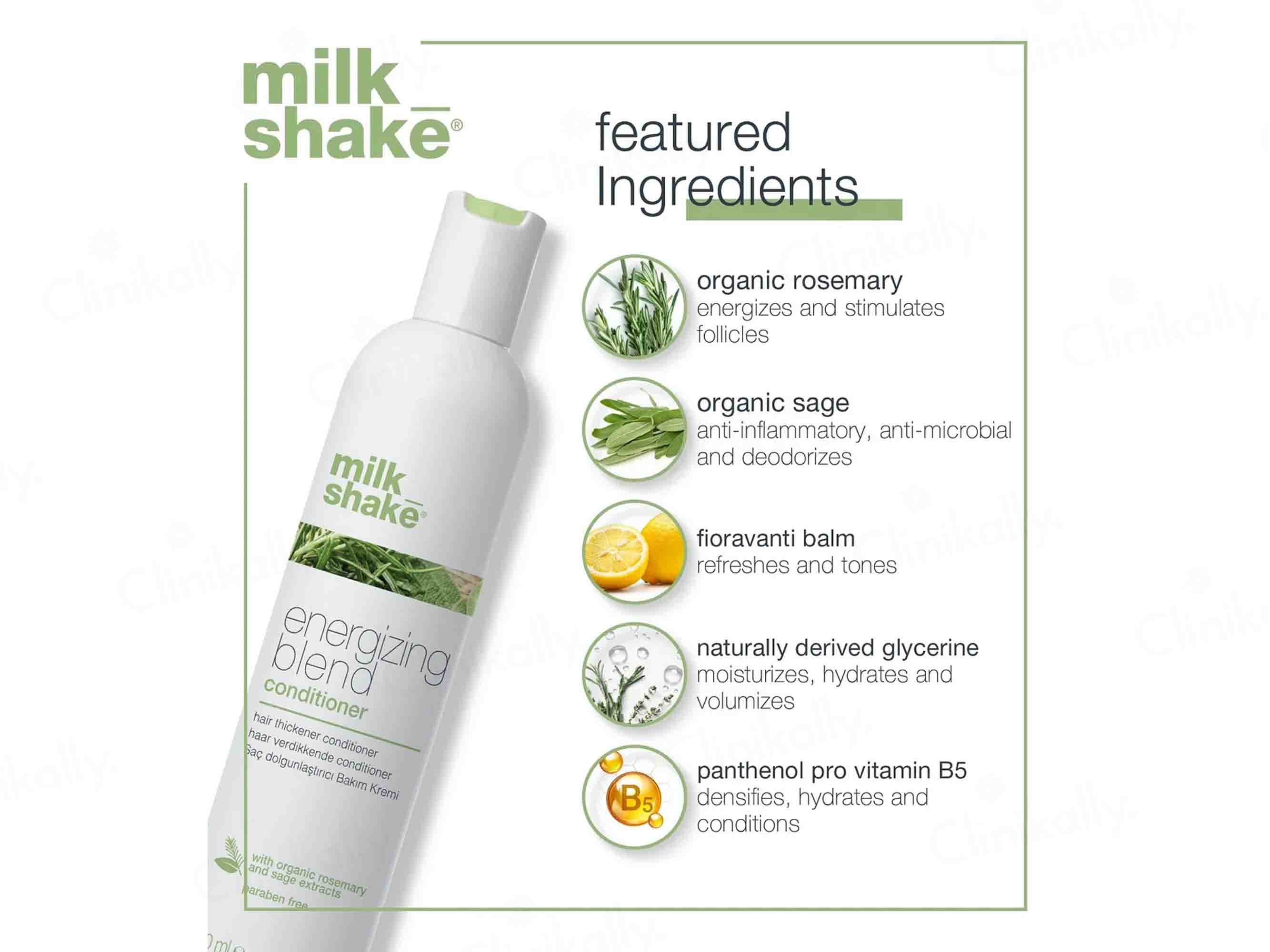 Milk Shake Energizing Blend Conditioner is a revitalizing, paraben-free formula designed to restore hair and scalp health while boosting fullness and shine. Enriched with organic rosemary, sage, eucalyptus, and panthenol, it stimulates the scalp, thickens strands, and promotes healthy hair growth. The refreshing herbal infusion soothes irritation, reduces buildup, and strengthens thinning or fragile hair from root to tip. With every wash, it leaves hair feeling energized, soft, and fuller-looking—ideal for daily use and all hair types seeking volume, vitality, and natural nourishment through botanically powered care.