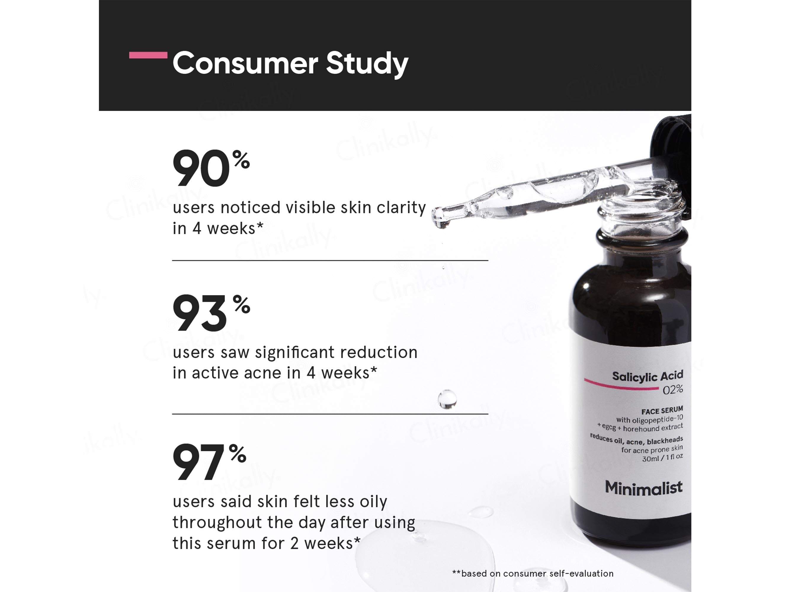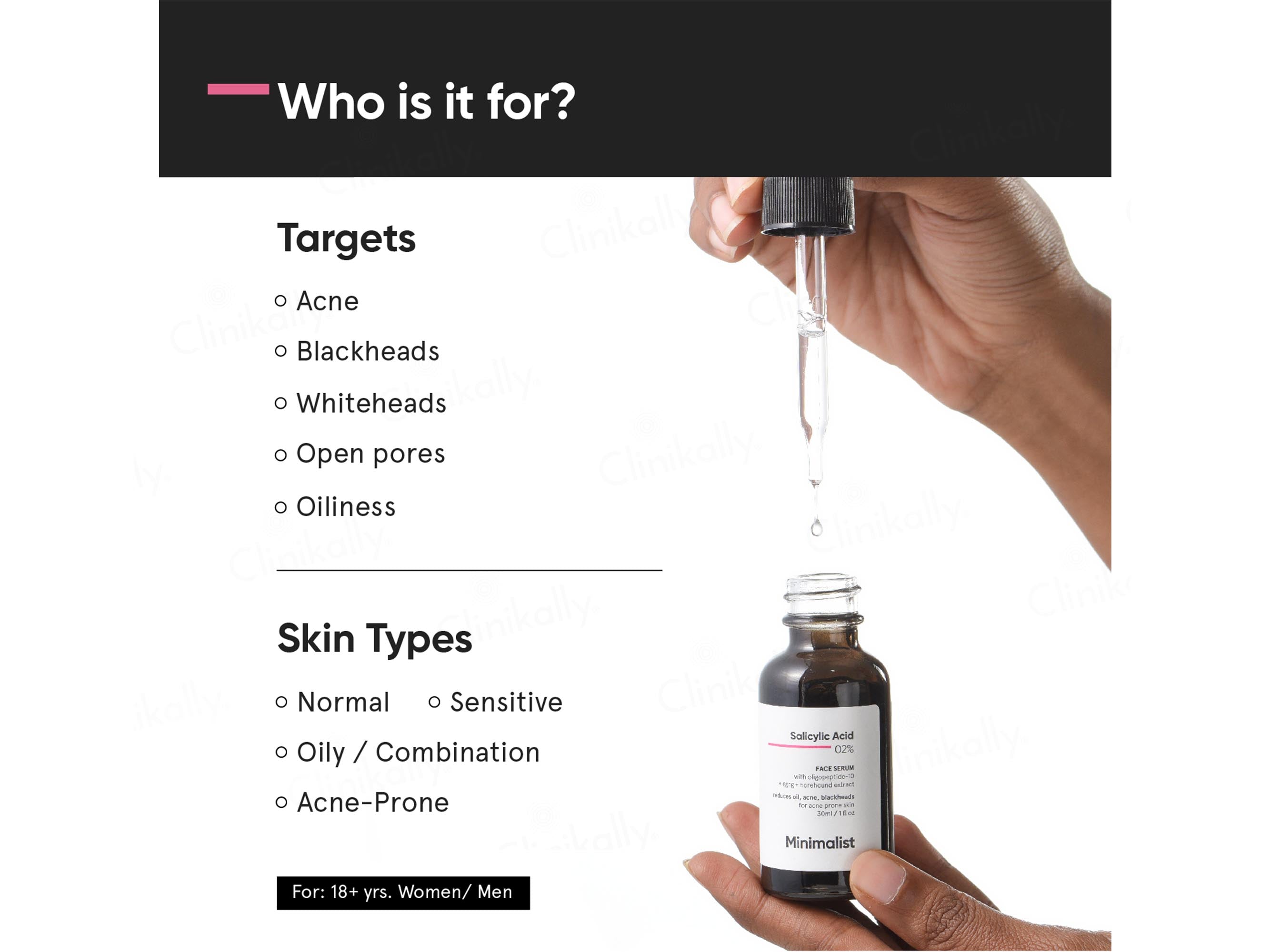 - After cleansing and toning, apply 2-3 drops of the Minimalist 2% Salicylic Acid Face Serum to your face, focusing on areas prone to breakouts.