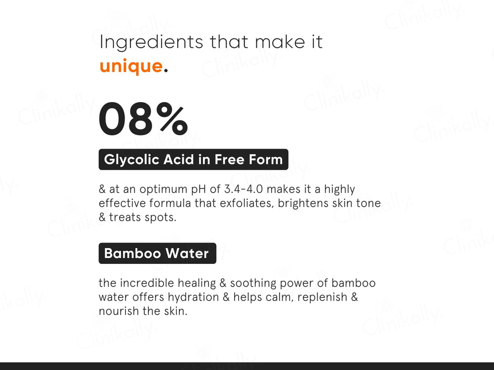 Glycolic Acid helps to remove dead skin cells, improve skin texture, reduce the appearance of fine lines, and even out skin tone, promoting a radiant complexion.