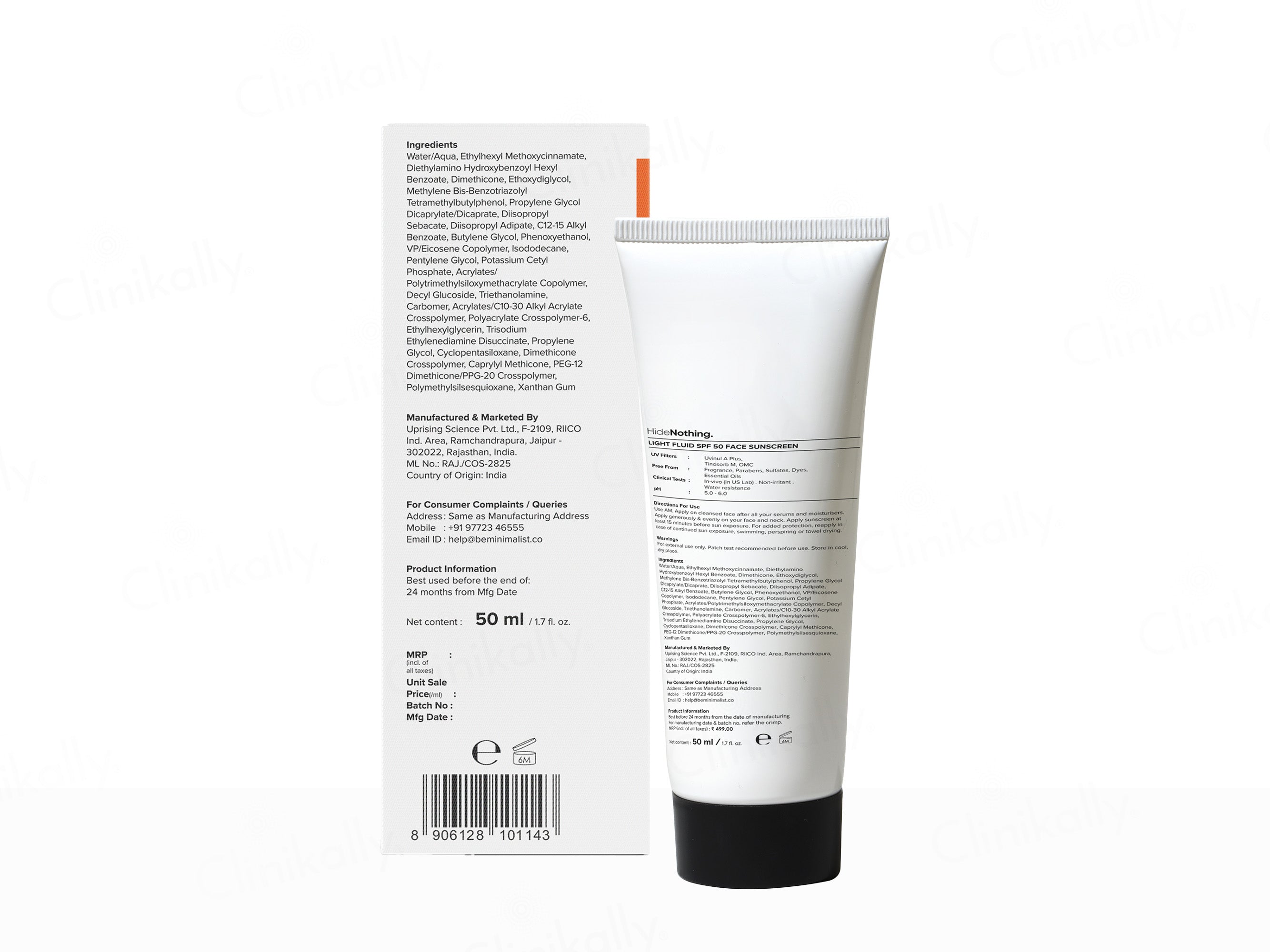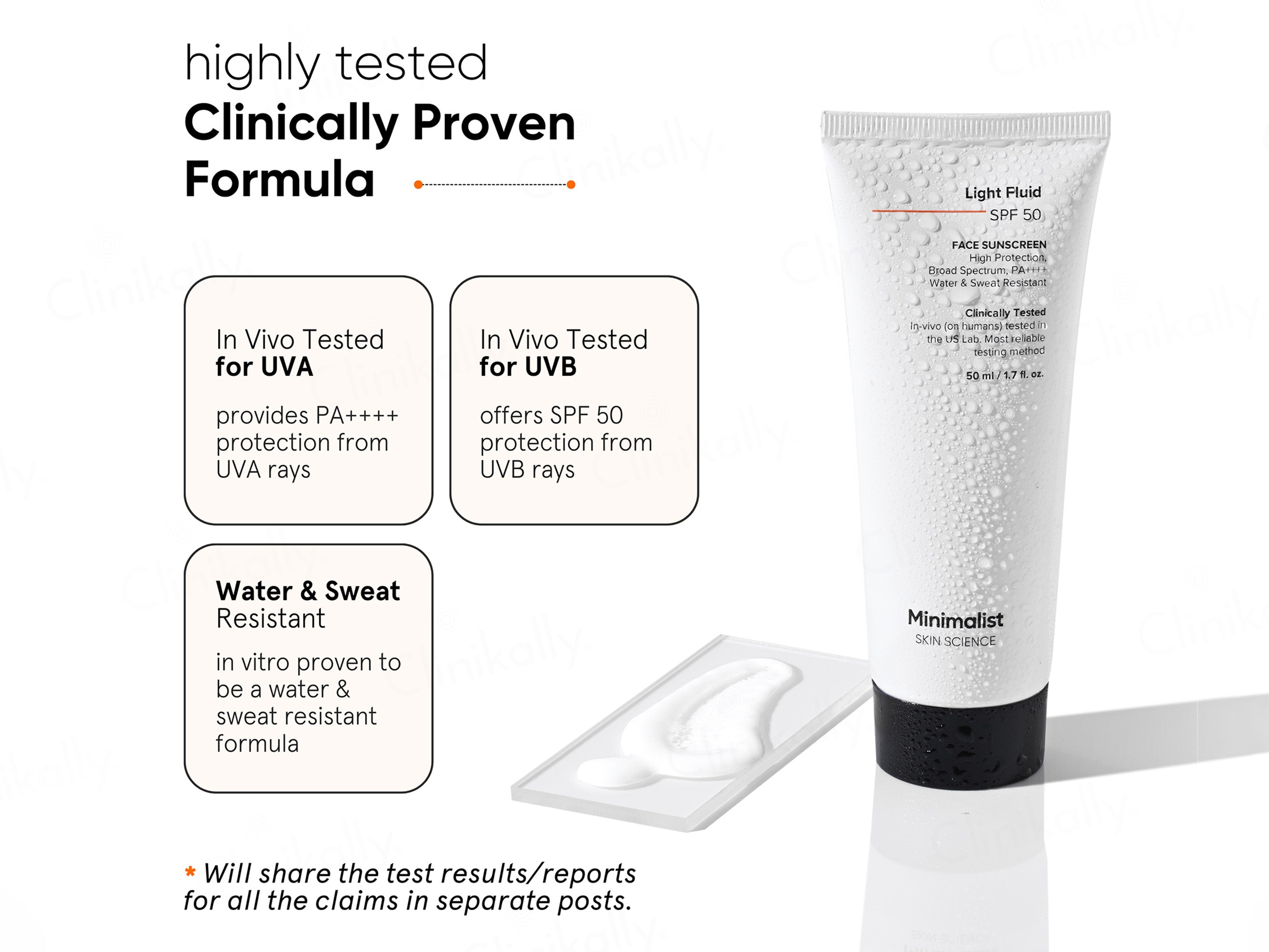 - Apply a generous amount of Minimalist Light Fluid Face Sunscreen SPF 50 PA++++ to your face and neck 15 minutes before sun exposure.