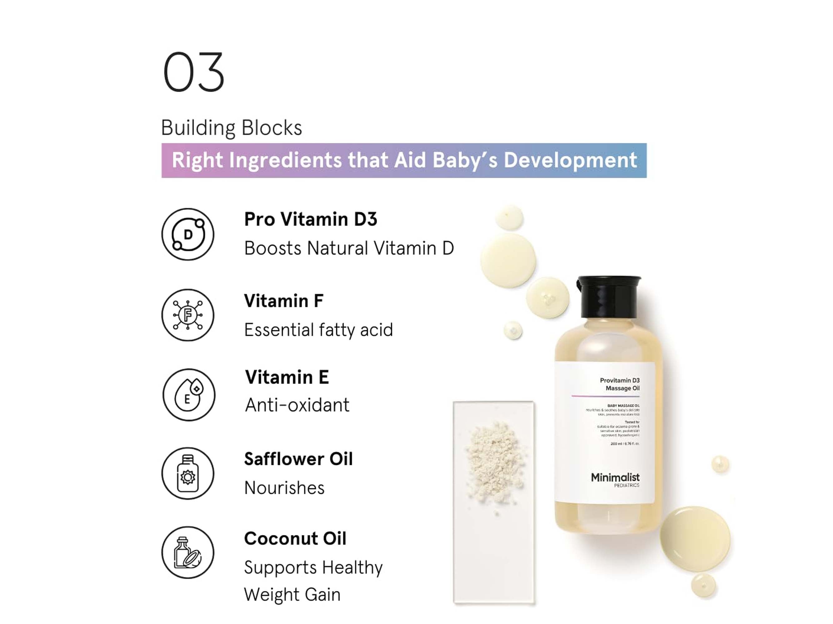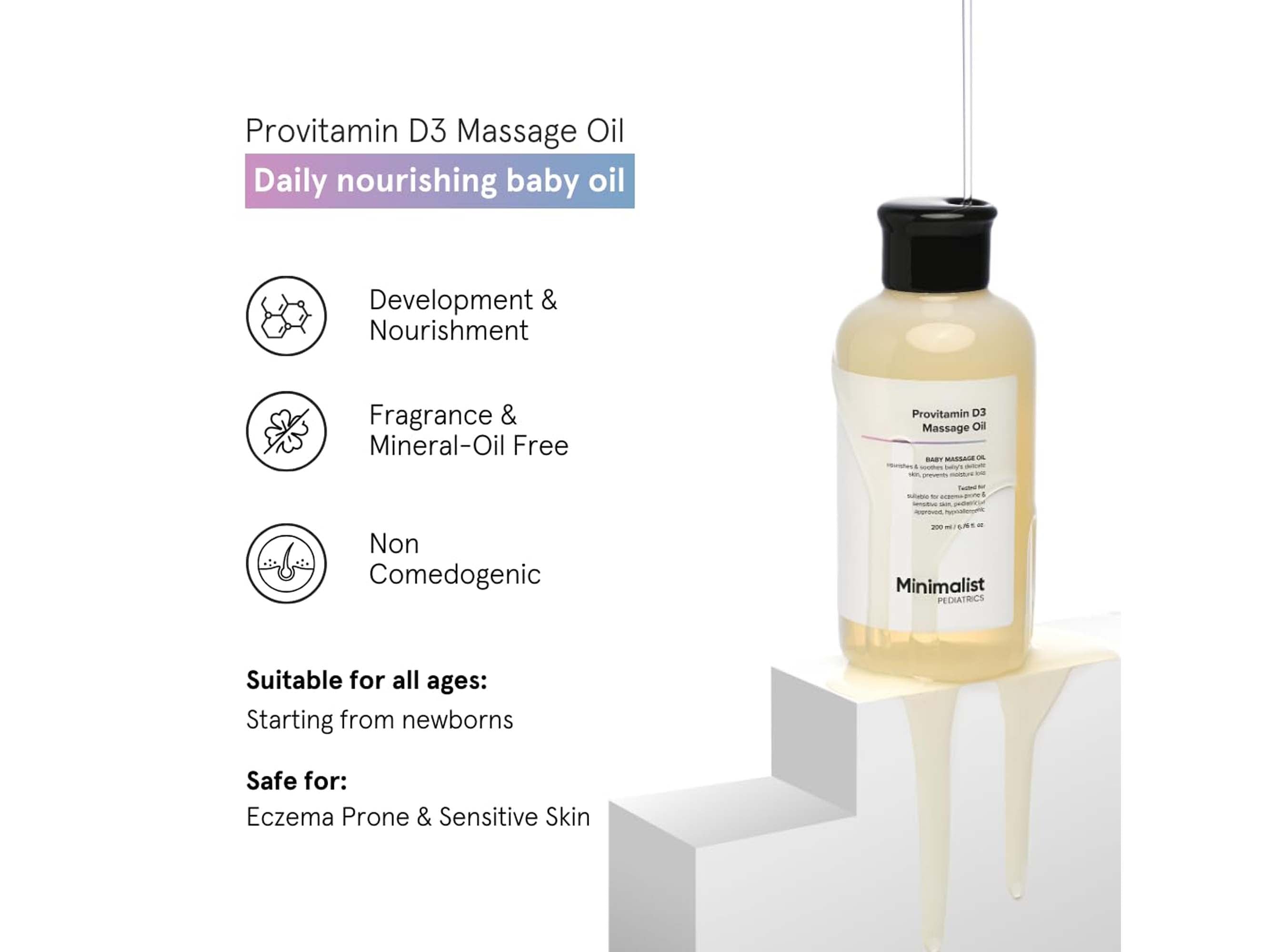 - Pour a small amount of Minimalist Pediatrics Provitamin D3 Baby Massage Oil into your hands and warm it by rubbing your hands together.