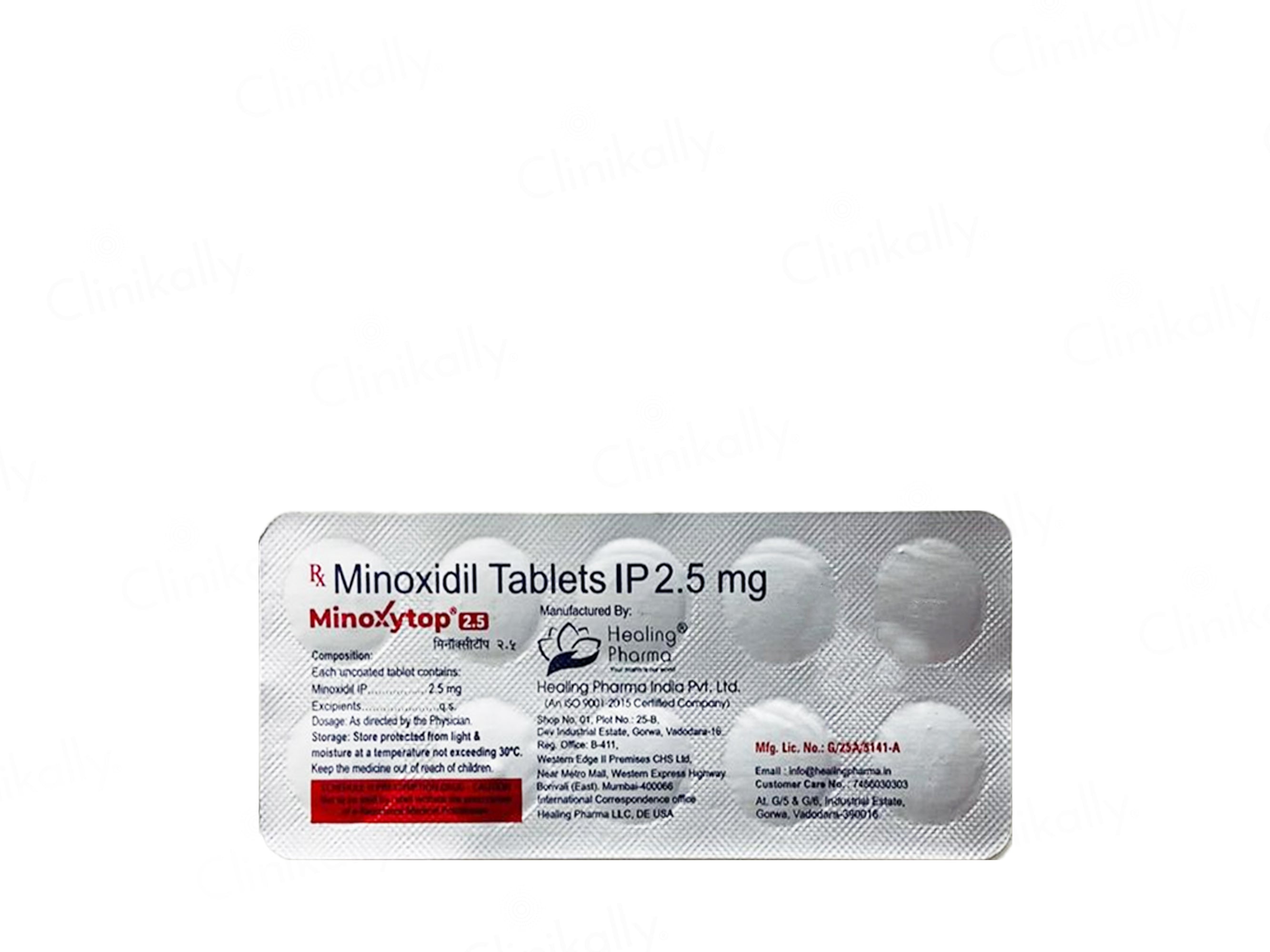 Minoxytop 2.5 Tablet is an oral medication primarily used for the treatment of hair loss (androgenetic alopecia) and, in some cases, resistant hypertension. Minoxidil works by widening blood vessels, improving blood flow to hair follicles, and stimulating hair growth. It prolongs the anagen (growth) phase of hair, helping to restore hair density and reduce thinning. It is generally prescribed when topical formulations are not sufficient or suitable.