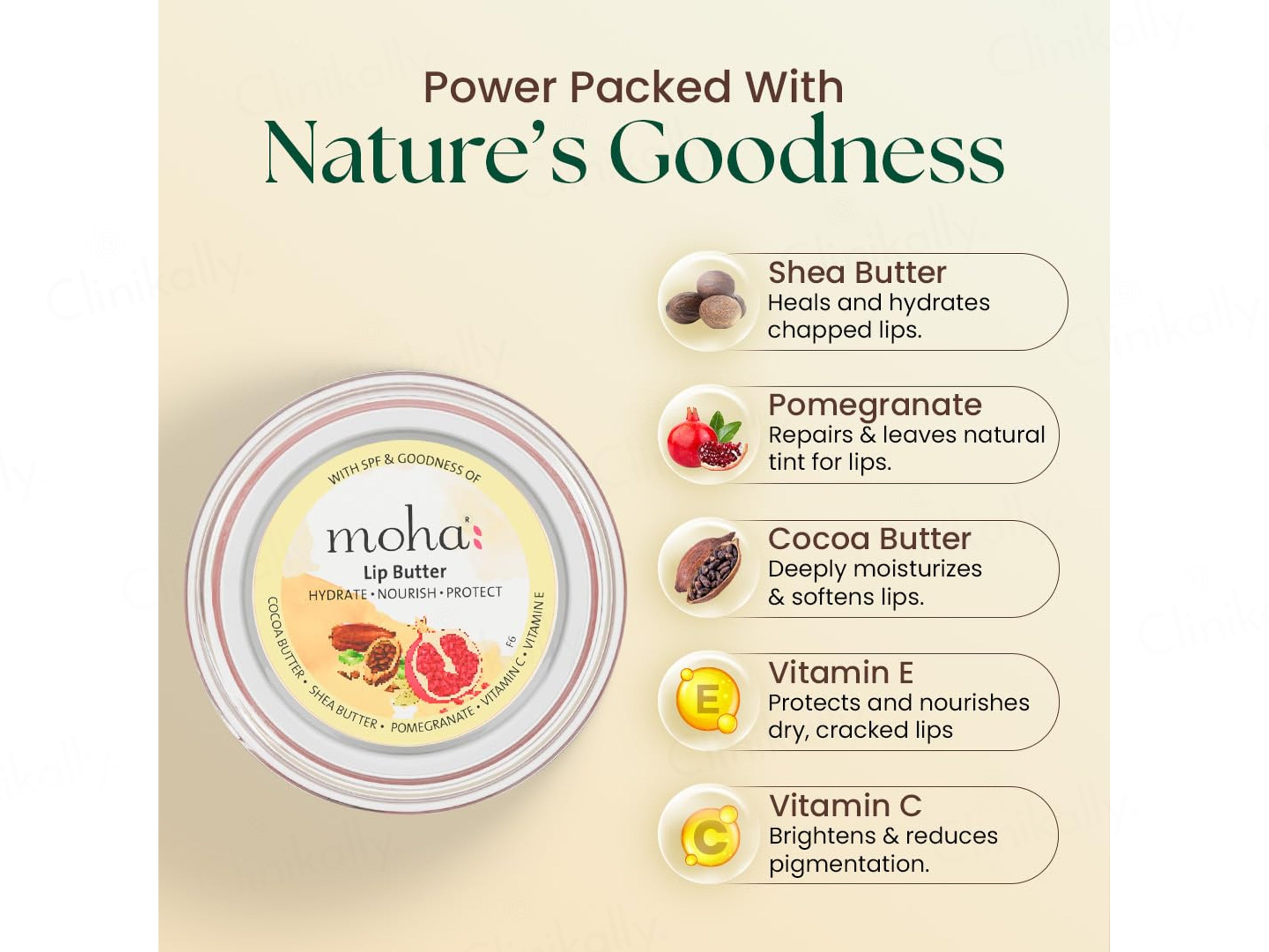 Moha: Nourishing & Hydrating Lip Butter is a deeply moisturising, SPF-enriched lip treatment that instantly hydrates, nourishes, and protects dry, chapped, and pigmented lips, leaving them soft, plump, and naturally brighter. Richly formulated with Shea Butter and Cocoa Butter for intense hydration and barrier repair, Pomegranate Extract to brighten pigmented lips and reduce darkness, Vitamin C to boost collagen and maintain lip elasticity, and Vitamin E for UV protection and anti-ageing benefits, this velvety lip butter smoothens lip lines, prevents moisture loss, and delivers long-lasting softness with a subtle sheen, making it perfect for daily AM-PM use.