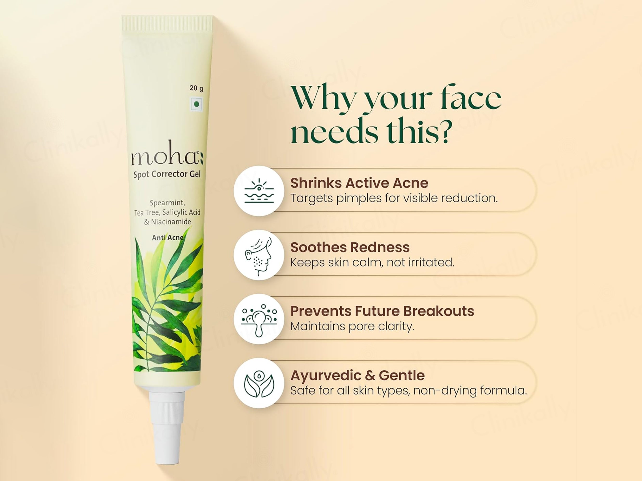 Moha Spot Corrector Anti Acne Gel is a quick-acting, non-drying Ayurvedic spot treatment gel designed to target active acne, shrink pimples, soothe redness and inflammation, and prevent future breakouts while maintaining pore clarity and skin barrier integrity for visibly clearer, calmer complexion without irritation, suitable for all skin types in a 20g tube for precise application on oily, acne-prone, or sensitive skin. Powered by salicylic acid to exfoliate and unclog pores, niacinamide to balance oil and fade post-acne marks, and soothing botanicals for gentle care, it features key ingredients like Salicylic Acid, Niacinamide, Melaleuca Alternifolia (Tea Tree) Leaf Oil, Mentha Spicata (Spearmint) Extract, and Bombax Ceiba (Shalmali) Flower Extract to deliver fast visible reduction in blemishes from the first use, calming inflamed skin with natural cooling and antimicrobial action while promoting balanced, refreshed results over time. This lightweight, barrier-protective formula absorbs quickly without greasiness, making it ideal for everyday targeted treatment in routines to heal angry pimples kindly with Ayurvedic efficacy.