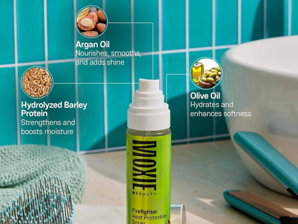Moxie Beauty Firefighter Heat Protection Hair Spray is used to protect hair from heat damage caused by styling tools up to 450°F.