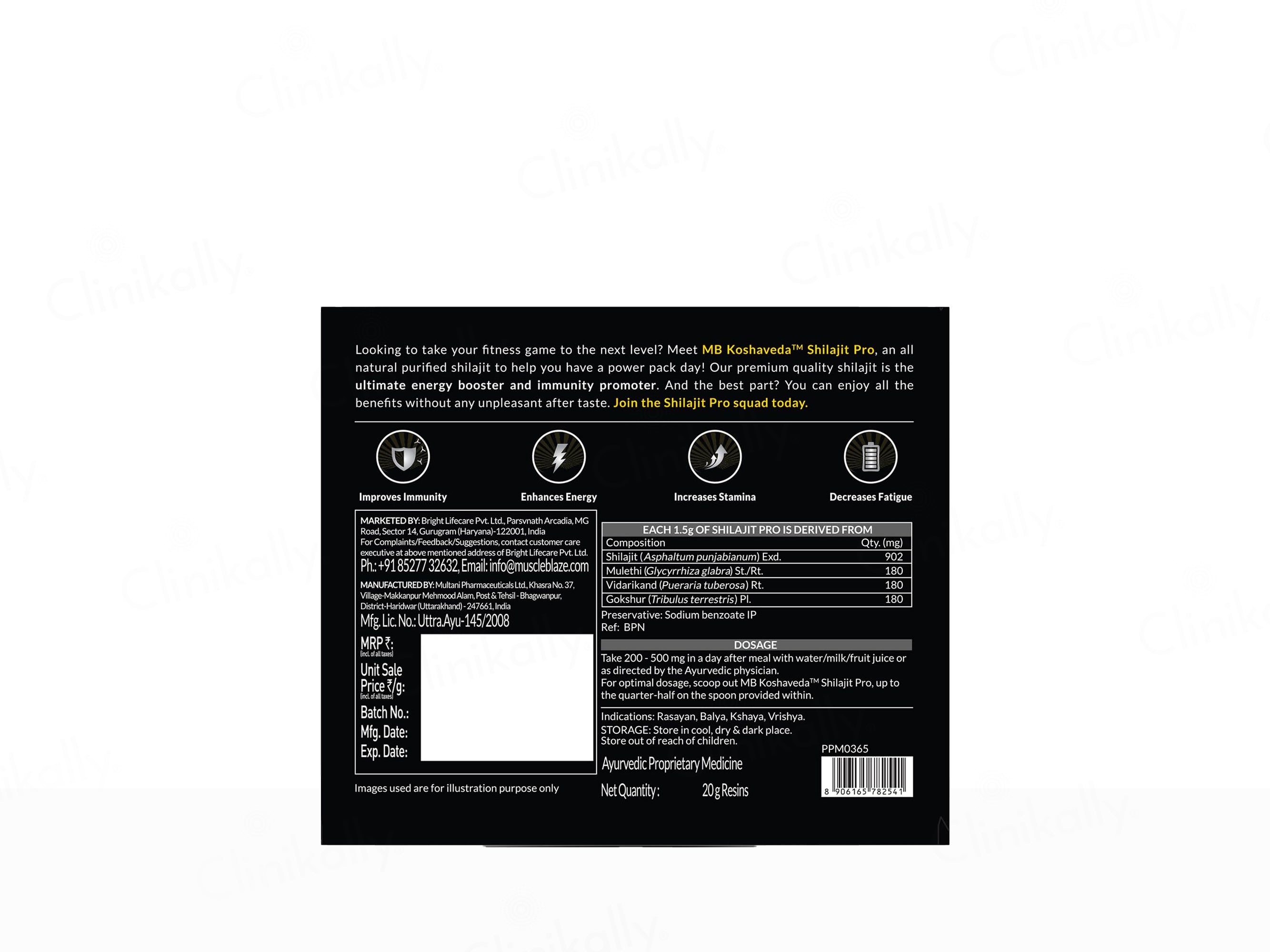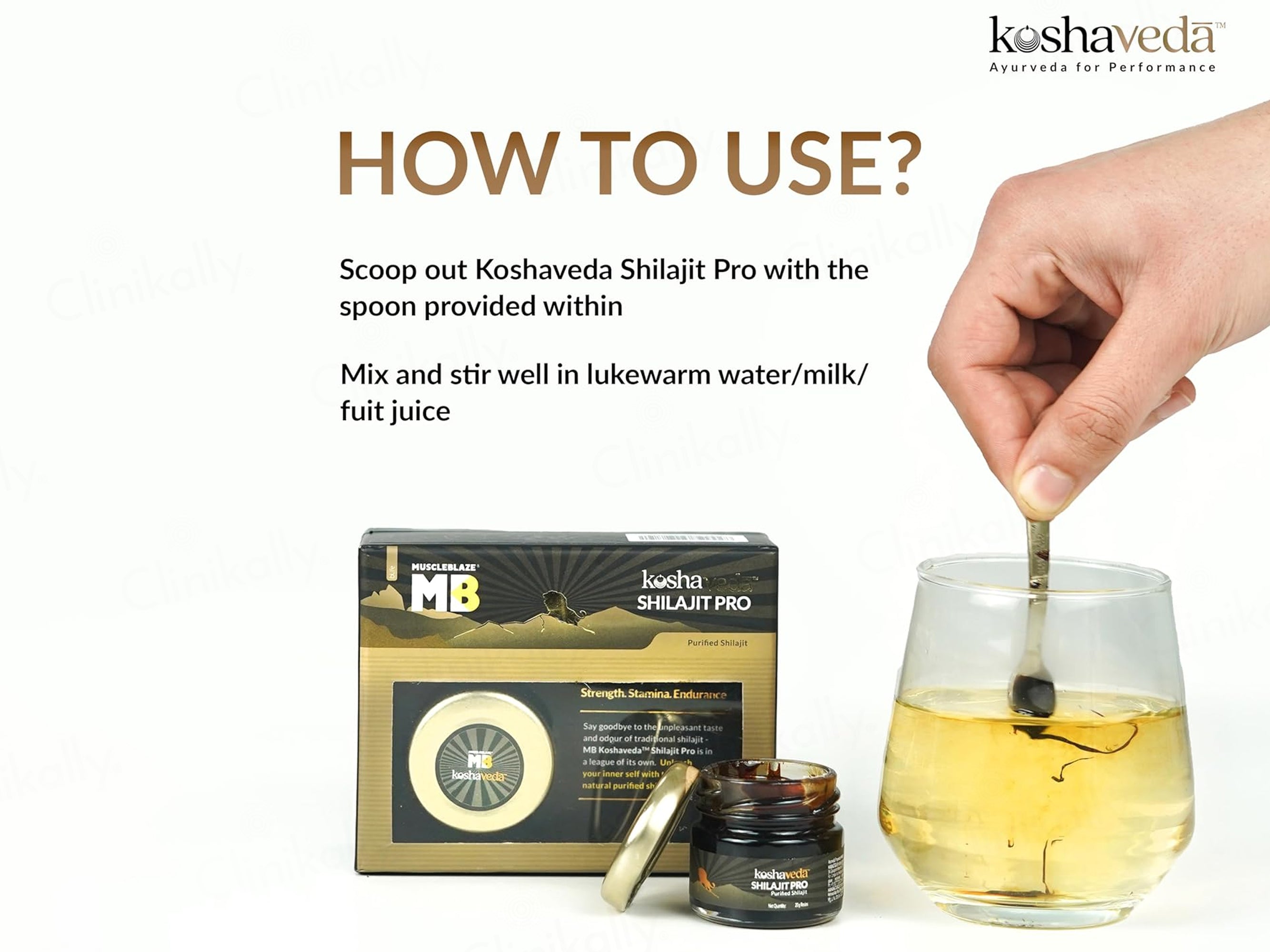 - Take 200–500 mg of MuscleBlaze Koshaveda Shilajit Pro Resin daily after a meal with water, milk, or fruit juice, or as directed by an Ayurvedic physician. For best results, scoop up to a quarter or half of the spoon provided for accurate dosage.