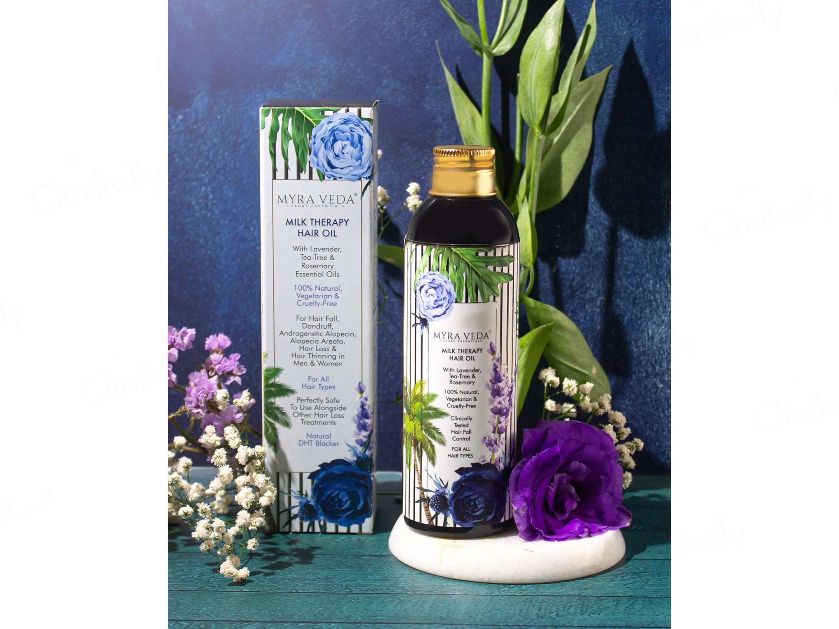 Myra Veda Milk Therapy Hair Oil is a 100% natural, vegetarian, and cruelty-free Ayurvedic hair care formulation designed to address hair fall, dandruff, androgenic alopecia, and hair thinning in both men and women, enriched with a potent blend of milk extracts, herbal botanicals, and essential oils to deeply nourish the scalp, strengthen hair roots, and promote healthier, fuller-looking hair over time; infused with ingredients like Bhringaraj, Amla, Indigo, and multiple milk sources combined with Sesame Oil and essential oils of Lavender, Tea Tree, and Rosemary, this therapeutic oil works as a natural DHT blocker to help reduce hair loss while improving scalp health and circulation, making it suitable for all hair types and safe to use alongside other hair treatments when applied consistently as directed for optimal results.