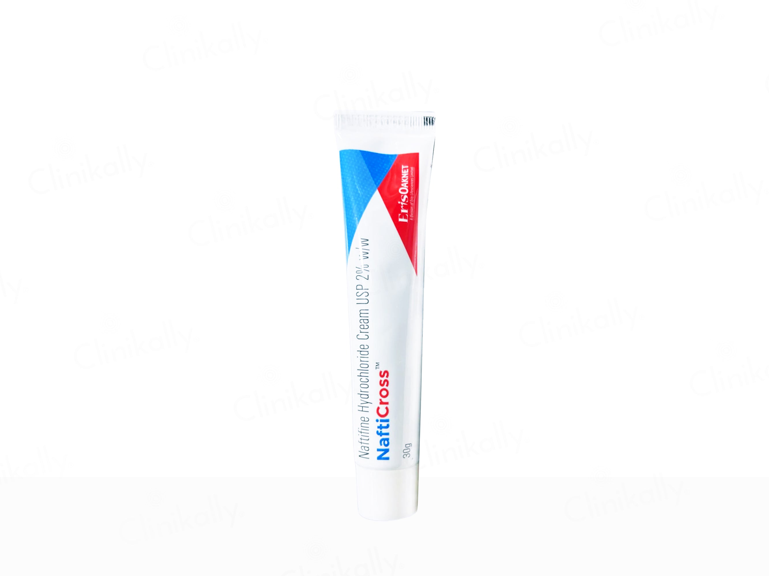 Nafticross Cream is a topical antifungal medication containing Naftifine Hydrochloride 2% w/w. It belongs to the allylamine class of antifungals and works by inhibiting fungal cell membrane synthesis, thereby eliminating fungal infections. It is commonly prescribed for athlete’s foot, jock itch, ringworm, and other dermatophyte infections, offering relief from itching, burning, and redness.