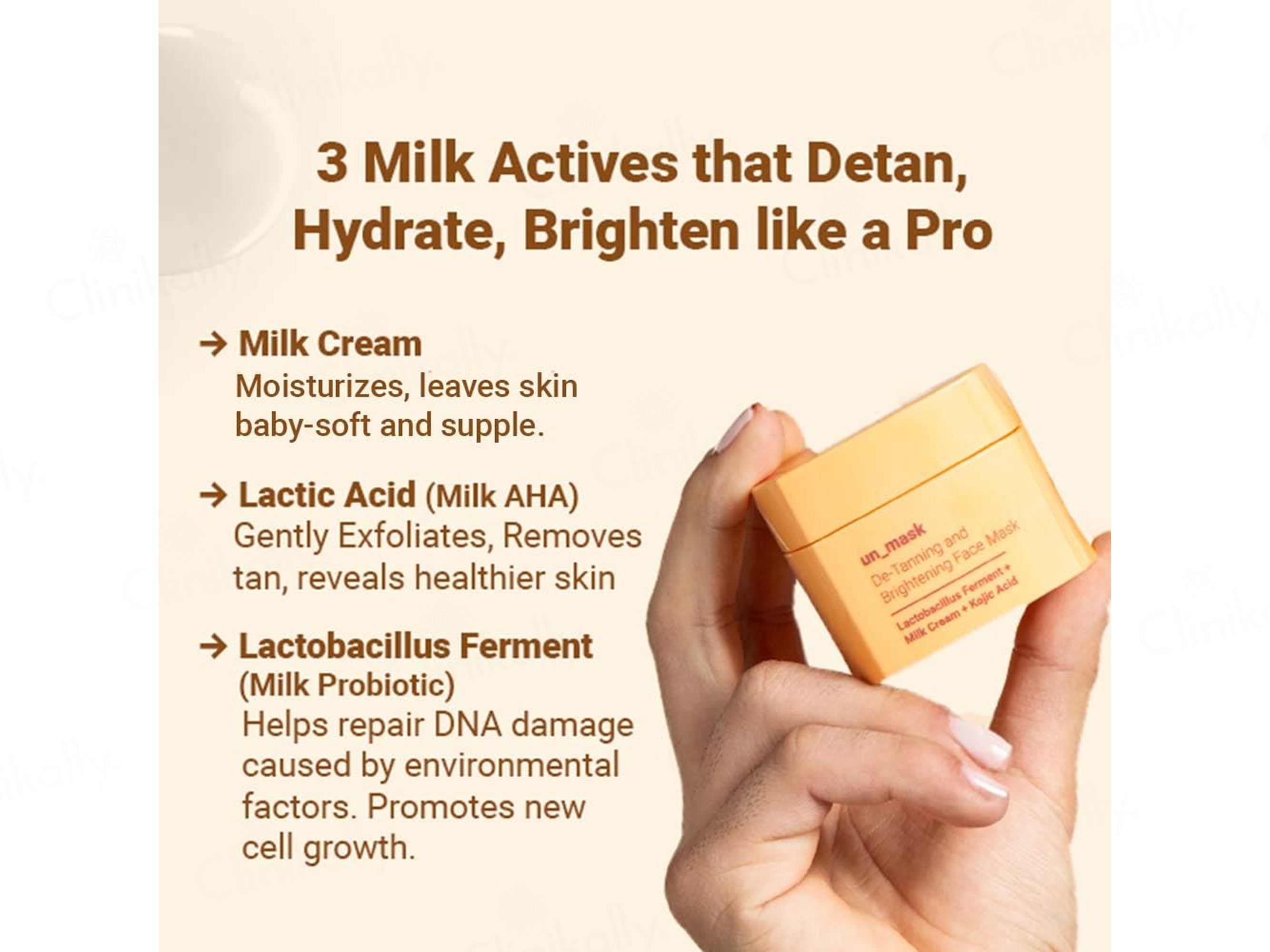 Neude Unmask Everyday De-Tanning, Hydrating and Brightening Face Mask is a powerful yet gentle multi-action face mask designed to dissolve tan instantly, brighten dull skin, hydrate deeply, and soothe irritation using a blend of milk actives, exfoliating enzymes, and targeted brightening agents. Its formula is powered by Milk Cream for intense nourishment and barrier strengthening, Lactic Acid (Milk AHA) for gentle exfoliation and tan removal, and Lactobacillus Ferment (milk probiotic) to boost cell renewal and repair skin-facing stressors. Kojic Acid targets hyperpigmentation and melanin regulation, while Lemon Peel Extract enhances radiance and clears pores, and Aloe Vera calms redness and hydrates. Additionally, five superfruit enzymes—Sugarcane, Orange, Lemon, Bilberry, and Sugar Maple—provide natural AHA exfoliation for smoother texture and long-term glow, making the mask ideal for normal to dry skin seeking brighter, detanned, and refreshed skin.