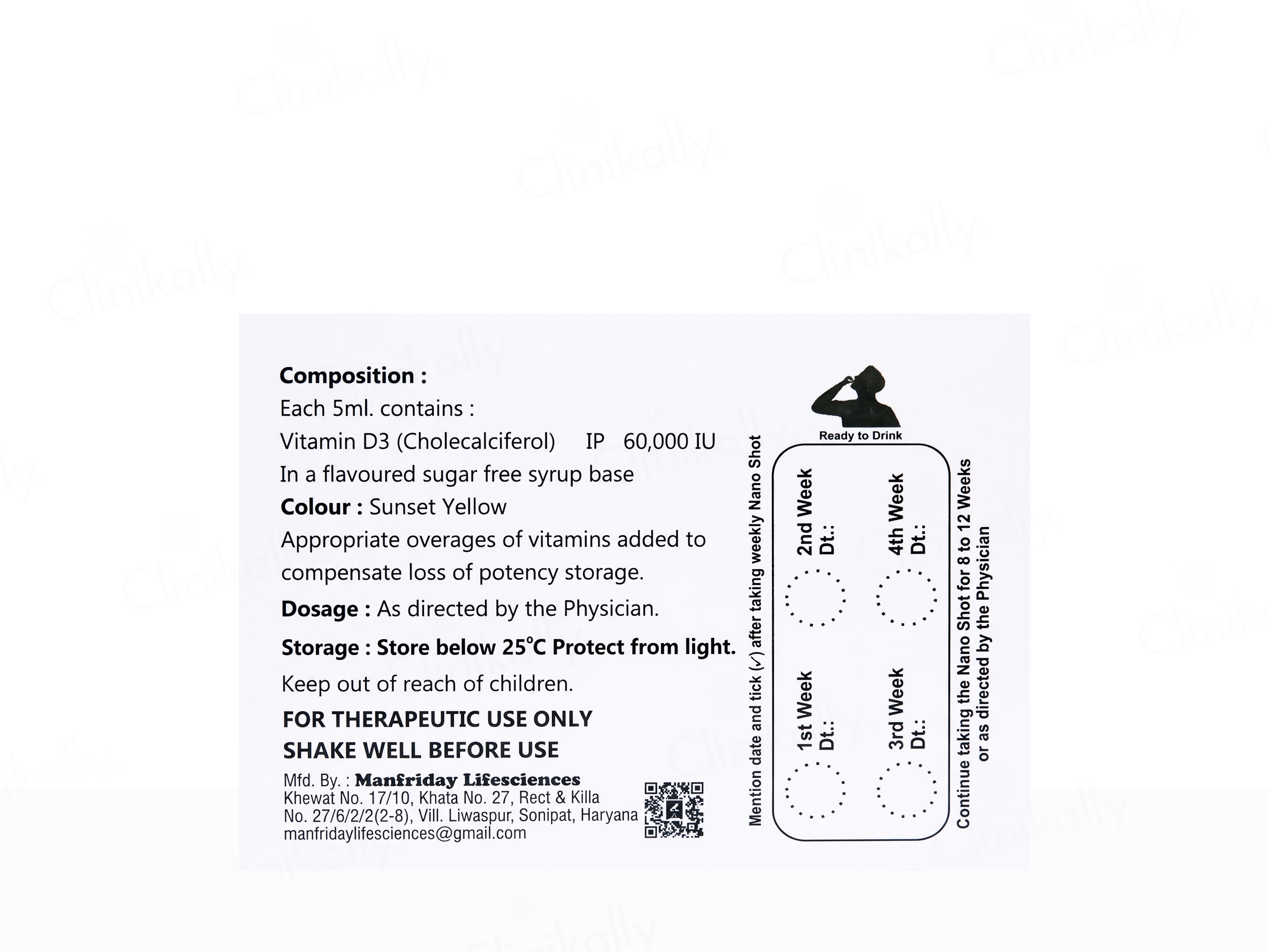 Nexup D3 Nano Shots Oral Solution - Orange Flavour is a sugar-free ready-to-drink oral solution formulated with Vitamin D3 (Cholecalciferol) 60000 IU in a flavoured syrup base. This orange flavour nano shot offers a convenient format for vitamin D supplementation and is designed for easy consumption. With its single-dose liquid format, it provides an effective amount of Vitamin D3 for regular supplementation while supporting daily wellness needs. The formulation is presented as nano shots with an easy-to-consume oral solution format, making it a simple and convenient option for Vitamin D3 supplementation with a pleasant orange flavour and sugar-free composition.
