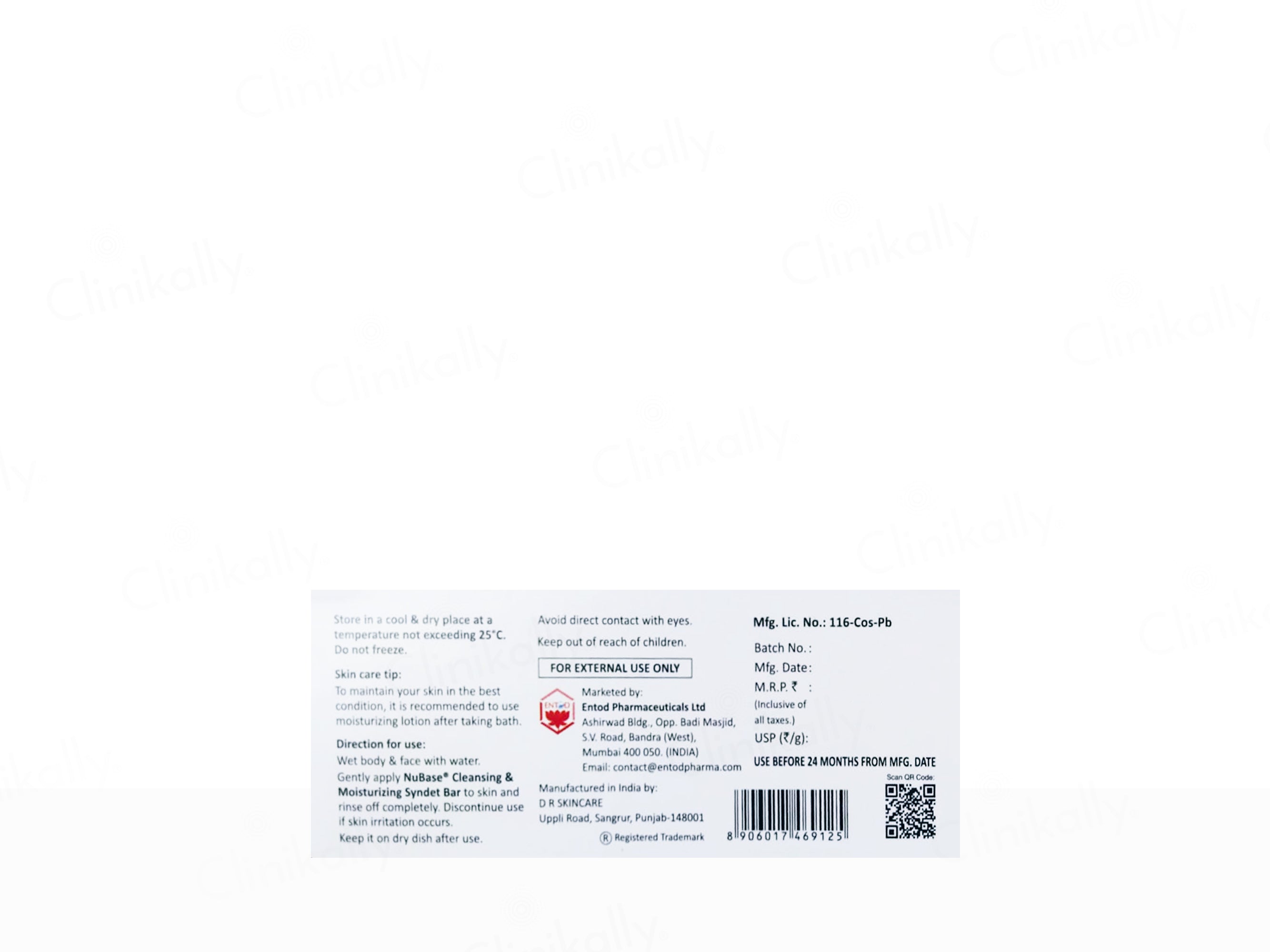 - Wet the face and body with lukewarm water, gently massage NuBase Cleansing & Moisturising Syndet Bar onto the skin to form a mild lather, rinse thoroughly, and pat dry; use daily or as recommended.