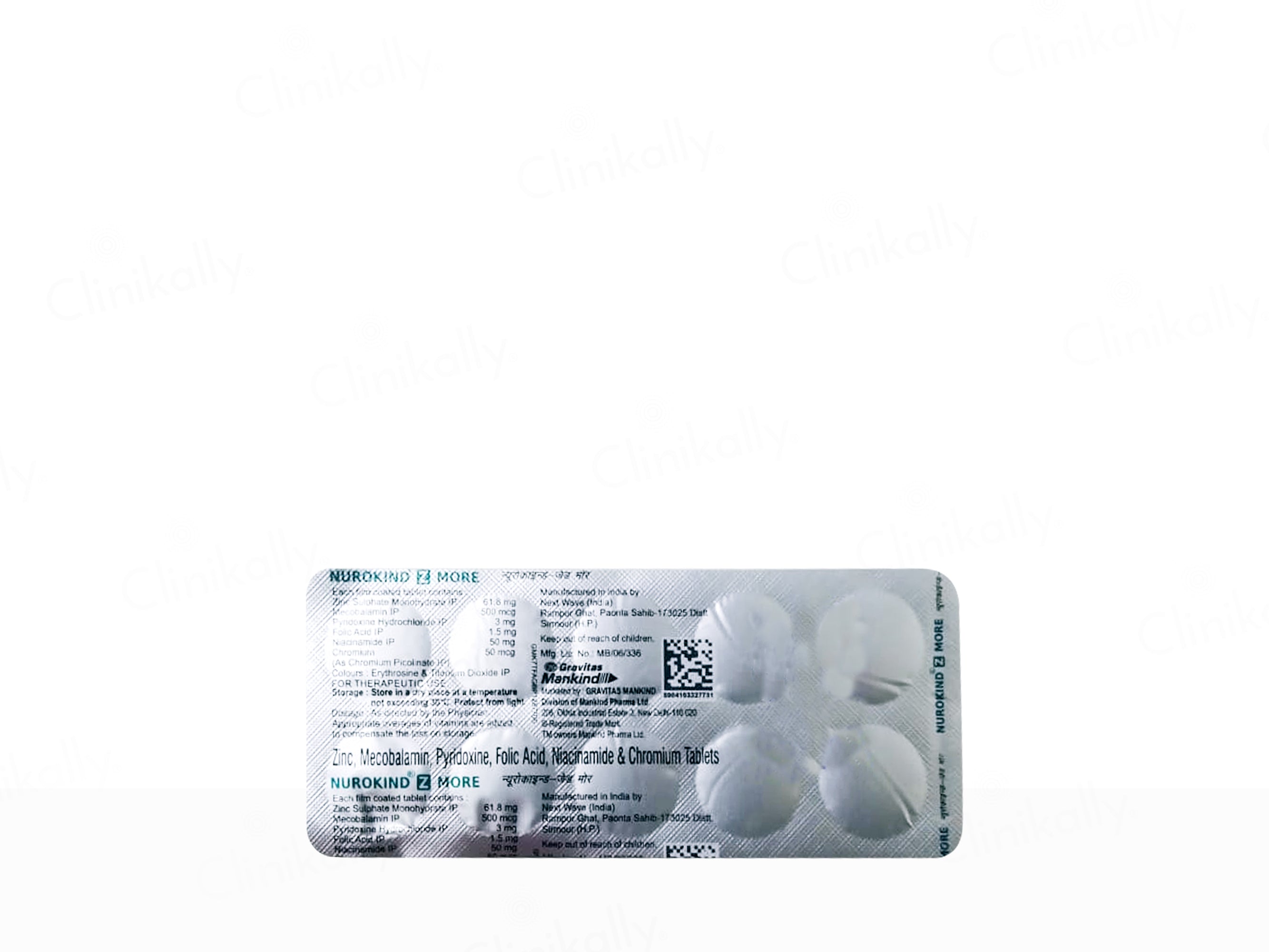Nurokind-Z More Tablet is a nutritional supplement formulated to support nerve health, immunity, and overall metabolic function with a synergistic blend of vitamins and minerals. It contains Zinc Sulphate Monohydrate IP for boosting immunity and aiding cellular repair, Mecobalamin IP (Vitamin B12) to promote nerve regeneration and red blood cell formation, and Pyridoxine Hydrochloride IP (Vitamin B6) for neurotransmitter synthesis and amino acid metabolism. Folic Acid IP supports cardiovascular health and DNA synthesis, while Niacinamide IP enhances energy production and skin health. The addition of Chromium helps in regulating glucose metabolism, making this formulation especially useful for neuropathic support, energy balance, and strengthening overall wellness.