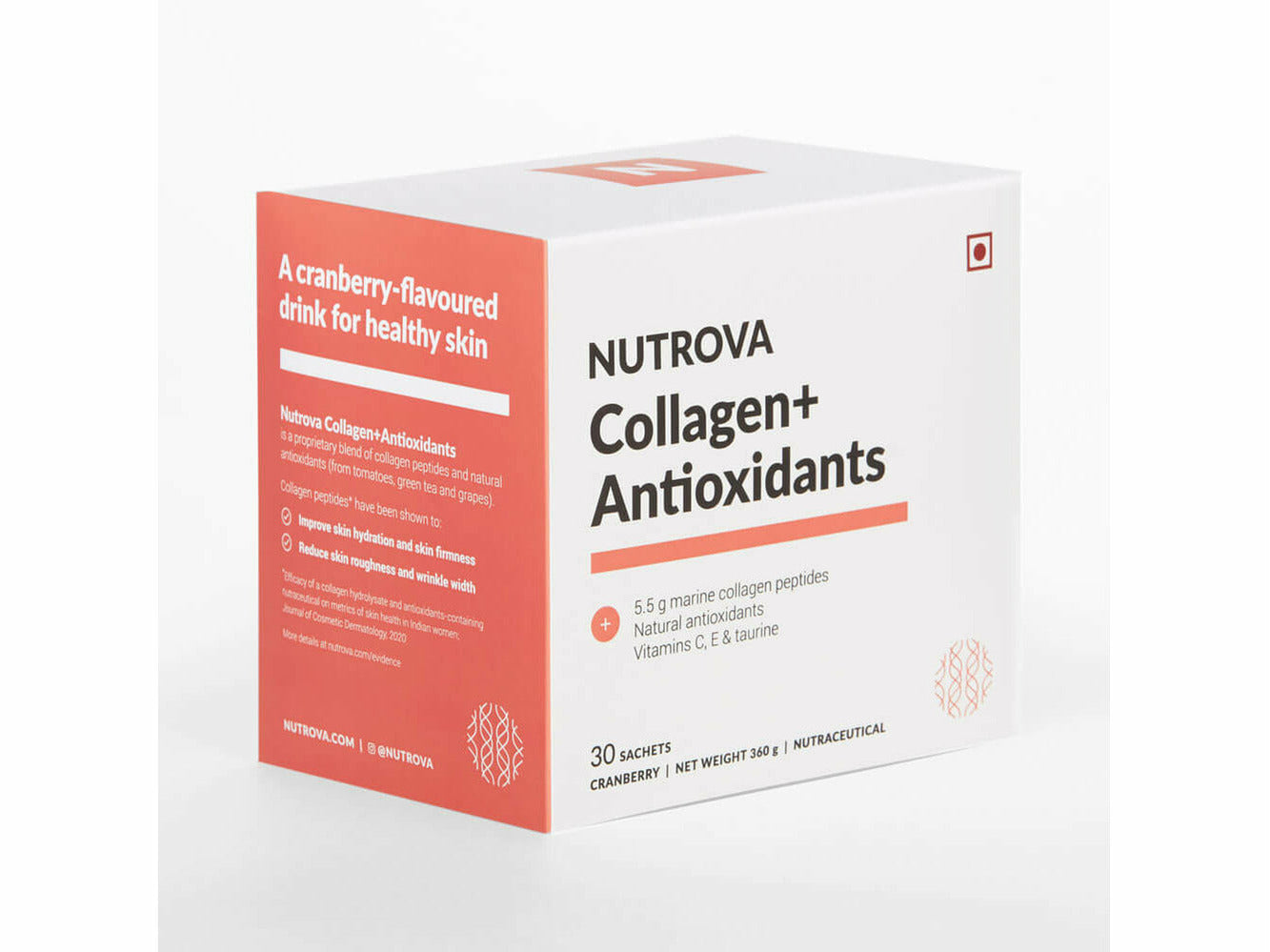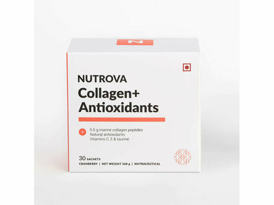 Nutrova Collagen+ Antioxidants increases skin hydration, firmness, and elasticity while reducing dullness, wrinkles, pigmentation, and roughness.