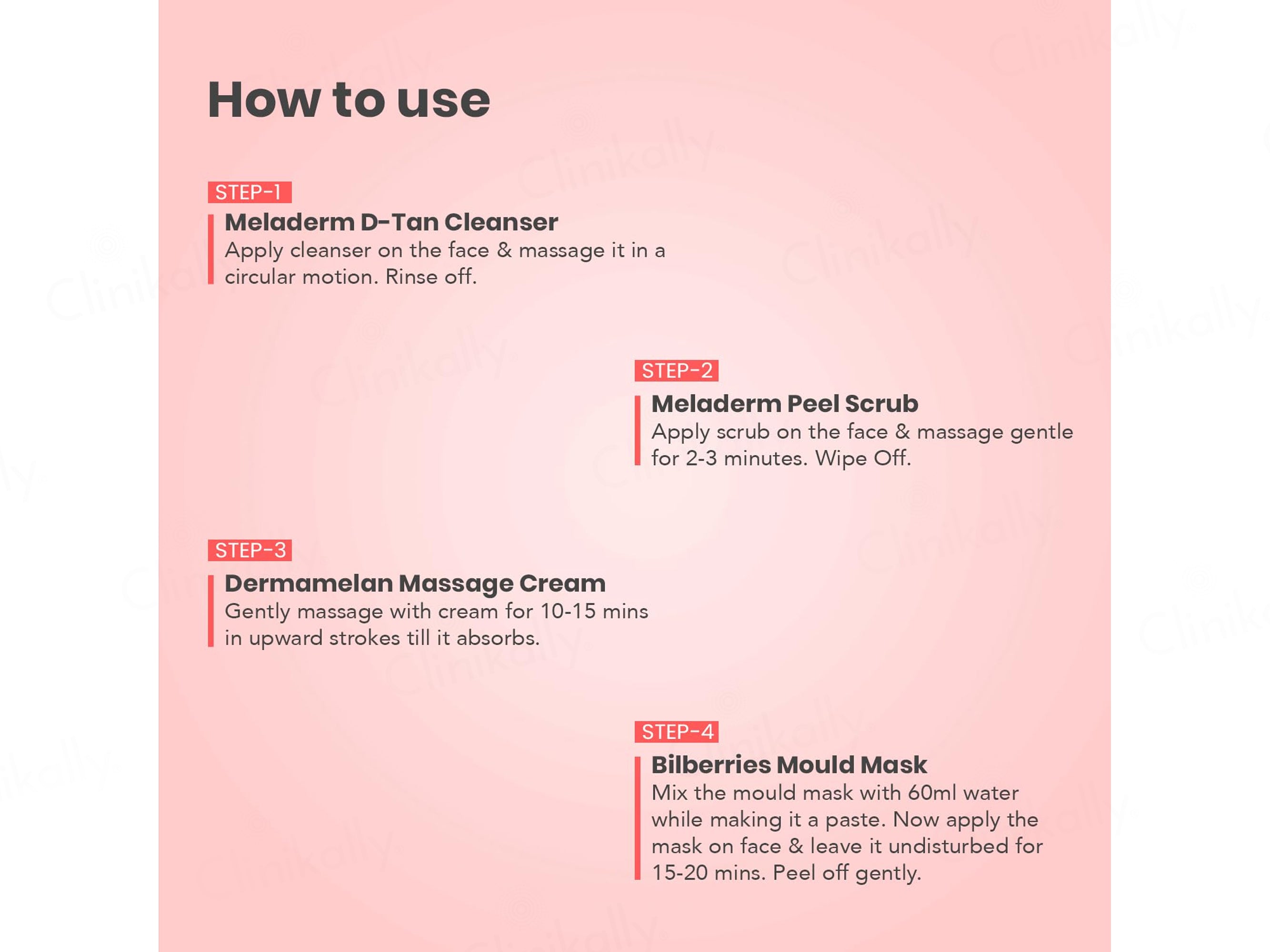 - Apply Meladerm D-Tan Cleanser on the face and massage in circular motions then rinse.
