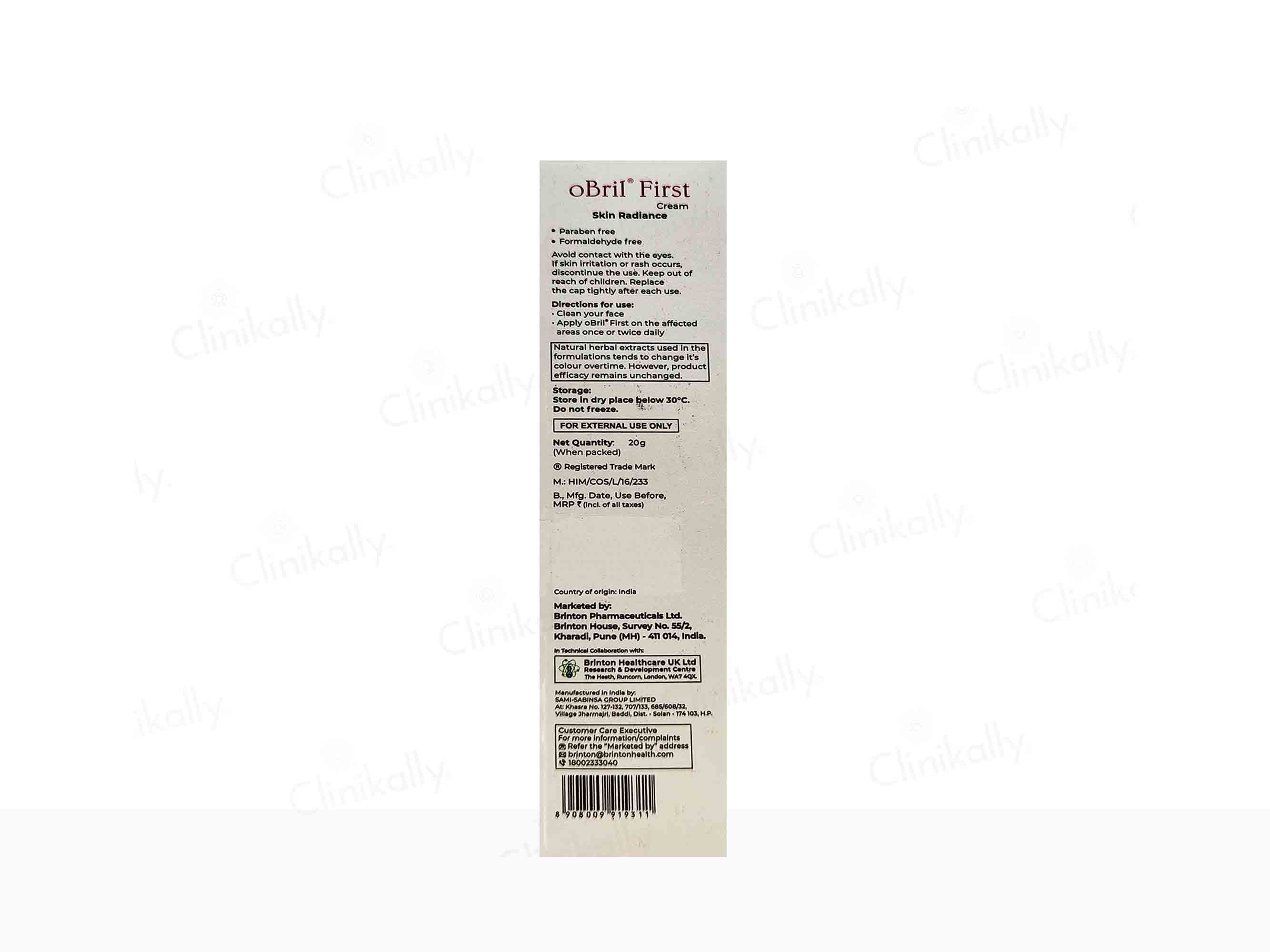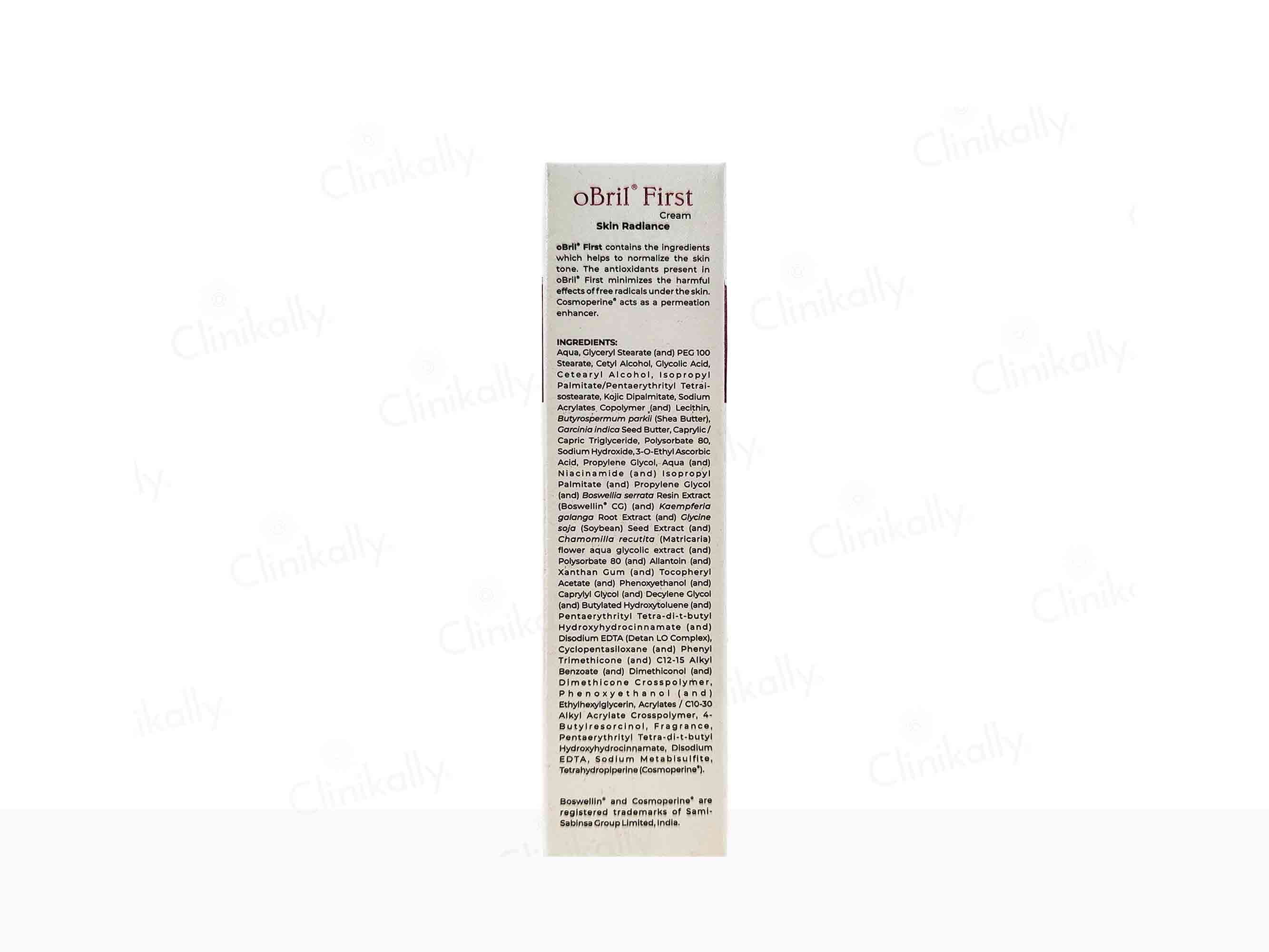 OBril First Skin Radiance Cream is a dermatologically advanced formulation enriched with DeTan LO Complex, 4-Butylresorcinol, 3-O-Ethyl Ascorbic Acid, Kojic Dipalmitate, and Glycolic Acid to target pigmentation, dullness, and uneven skin tone. Infused with patented CosmoPerine® for deeper ingredient penetration, it helps reduce dark spots, promote skin renewal, and restore luminous clarity. Enhanced with botanical extracts and antioxidants, it fights free radicals and improves skin texture. Ideal for dull, pigmented, or blemish-prone skin, this radiance cream delivers visibly flawless and glowing results with regular use.