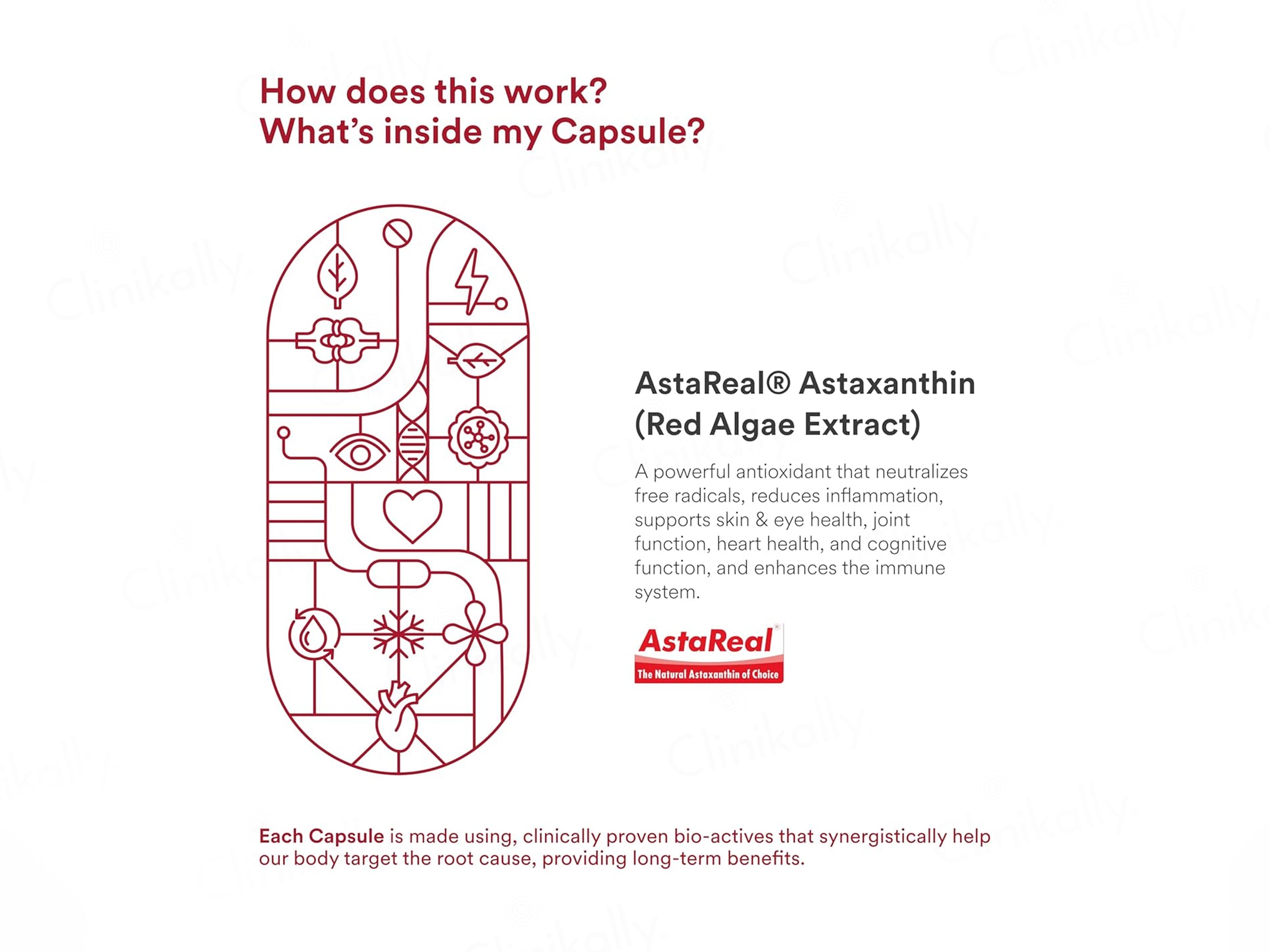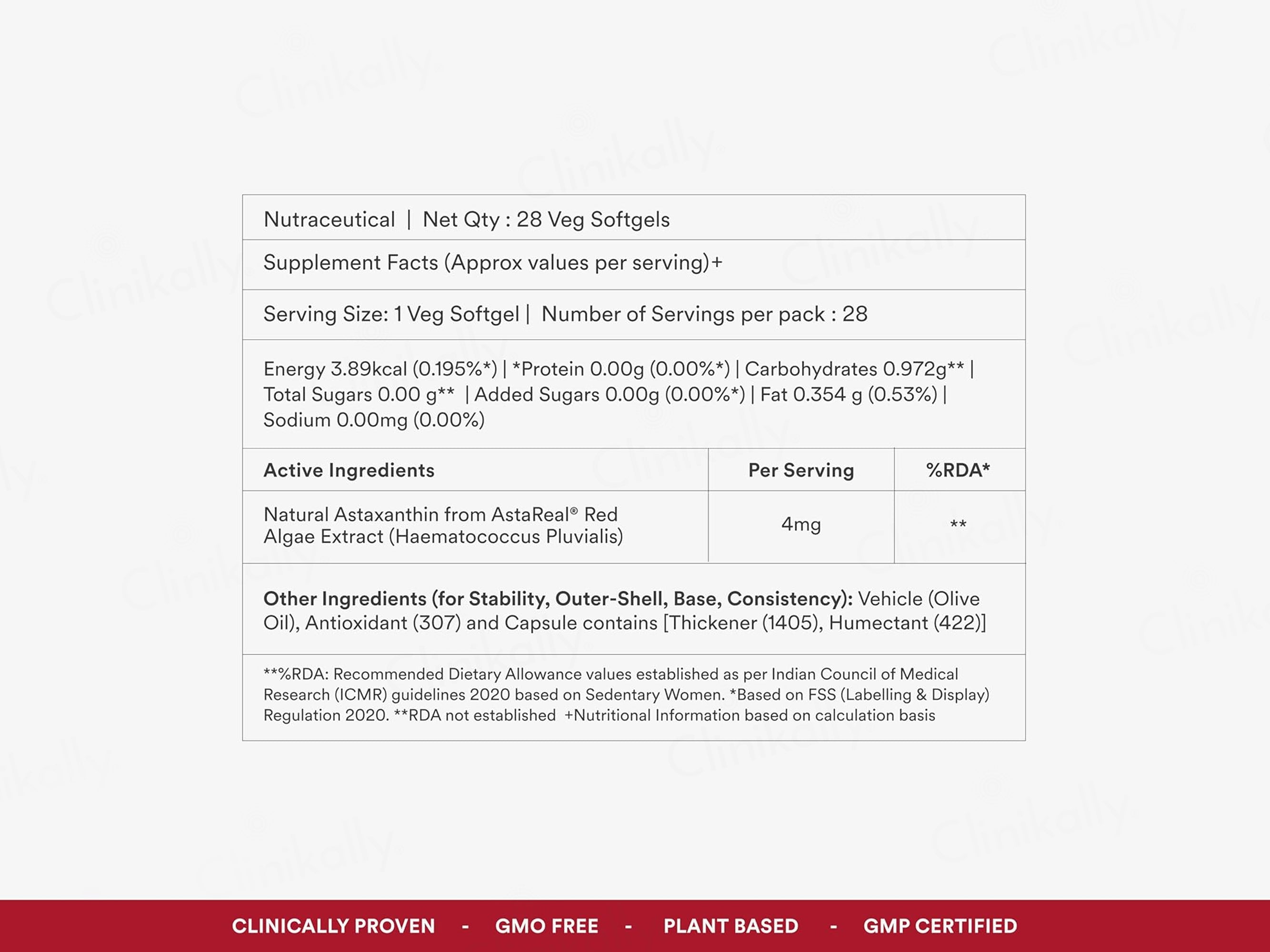 Origins Nutra Astaxanthin 4mg Nutraceutical Veg Softgel Capsule is a clinically proven, GMO-free, 100% vegan, GMP-certified potent antioxidant supplement sourced from 100% pure natural Astaxanthin via AstaReal® Red Algae Extract (Haematococcus pluvialis) to neutralize free radicals 6000 times more effectively than Vitamin C, combat oxidative stress and inflammation at the cellular level, enhance energy levels while reducing fatigue, stress, and tiredness, boost immunity, support heart, mind, and joint health, and promote healthy aging by protecting against UV radiation and premature cell death suitable for adults when taken daily with breakfast for root-cause protection and vitality. This evidence-based holistic formula acts as an internal sunscreen to shield skin from sun damage, improves muscle recovery for active lifestyles, reduces DNA damage and cellular inflammation, fosters joint flexibility and cardiovascular resilience, and enhances cognitive function through its superior bioavailability and carotenoid potency, delivering sustained antioxidant defense for radiant skin, robust immunity, and overall rejuvenation in a convenient 4-week pack of 28 softgels designed for consistent internal nourishment without false promises.