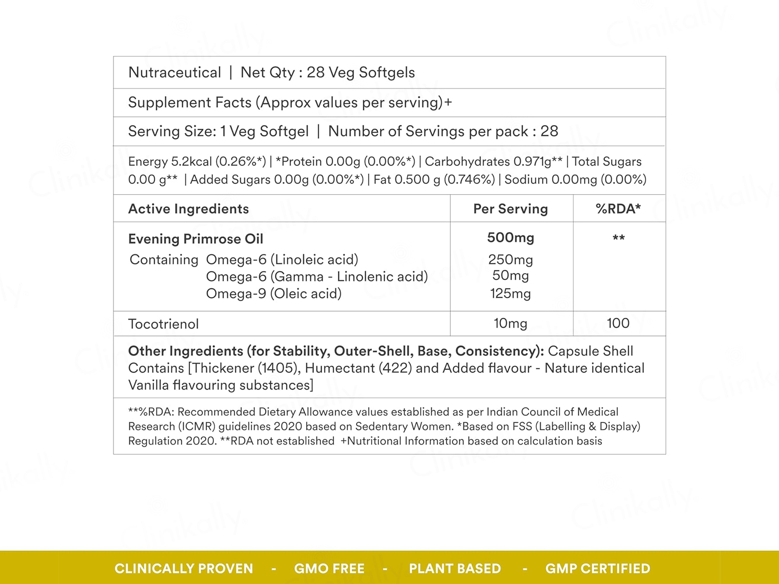 Origins Nutra Evening Primrose Oil 500mg Nutraceutical Veg Softgel Capsule is a clinically proven, 100% vegan, GMP-certified supplement derived from evening primrose seeds enriched with tocotrienols and omega-6 fatty acids to support hormonal balance, alleviate premenstrual syndrome (PMS) symptoms like cramps and discomfort, ease menopause-related issues, reduce inflammation, and promote skin health by combating acne, blemishes, scars, eczema, and dryness for supple, radiant complexion suitable for women and men when taken daily with meals for optimal absorption and results. This root-cause targeting nutraceutical fills the natural GLA gap in the body, neutralizes excess omega-6 for anti-inflammatory effects, regulates hormones, boosts bone, joint, and nerve health, aids fat burning for weight management, and provides essential linoleic acid alongside vitamin E for overall vitality in a convenient 4-week pack of 28 softgels designed for consistent internal nourishment without false promises.