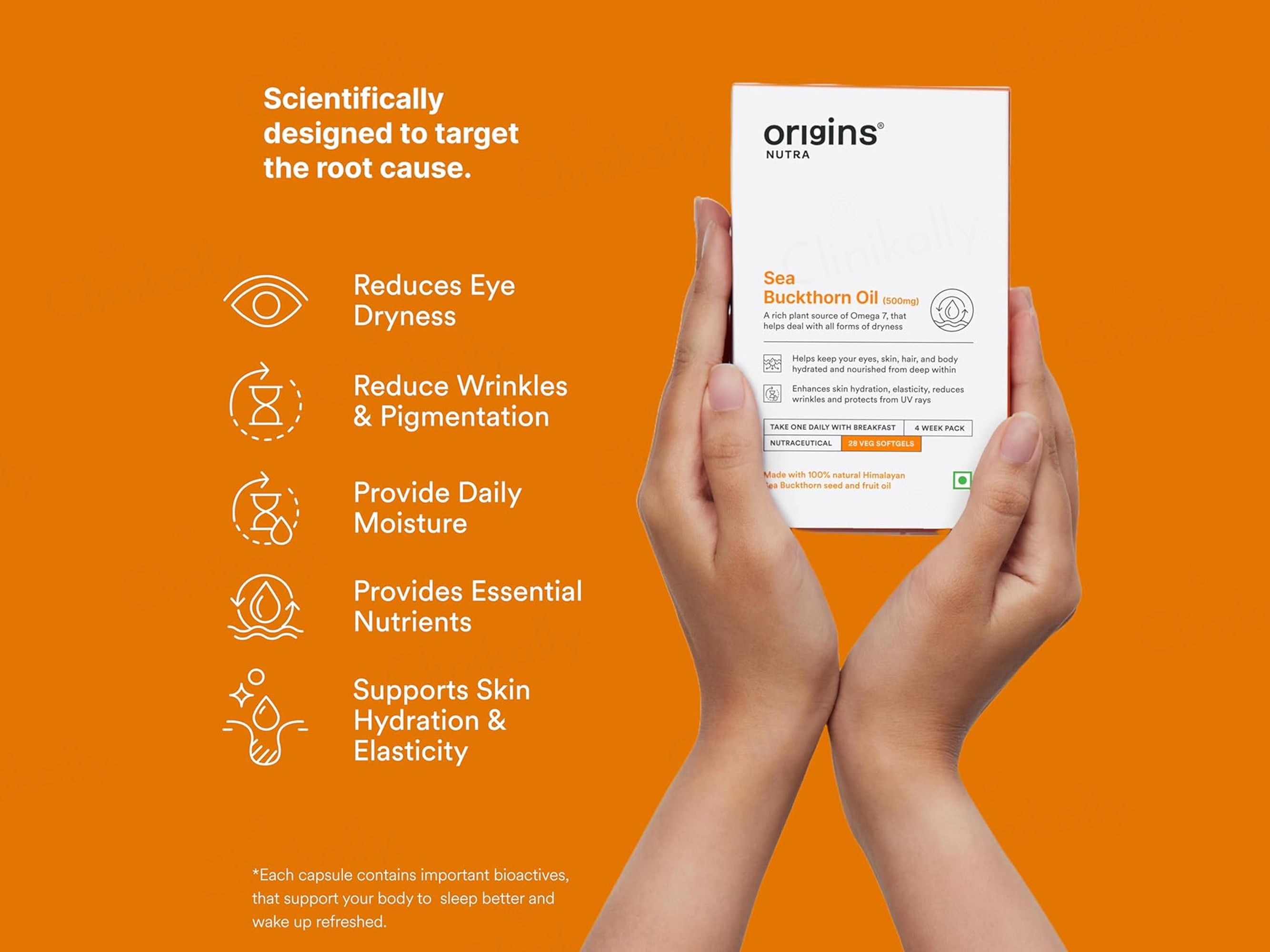 Origins Nutra Sea Buckthorn Oil 500mg Nutraceutical Veg Softgel Capsule is a clinically proven, GMO-free, 100% vegan, GMP-certified rich plant source of Omega-7 fatty acids from 100% natural Himalayan Sea Buckthorn seed and fruit oil designed to deeply hydrate and nourish eyes, skin, hair, and body from within, combat all forms of dryness, enhance skin moisture and elasticity, reduce wrinkles, and provide UV ray protection against oxidative damage for supple, radiant complexion and overall vitality suitable for adults when taken daily with breakfast to target root causes of dehydration and aging without common allergens. This evidence-based holistic supplement delivers essential palmitoleic acid (Omega-7) for cellular repair and lipid barrier strengthening, combined with tocopherols (Vitamin E) for antioxidant defense, promoting hair follicle health, eye lubrication, joint lubrication, and mucosal integrity while fostering collagen production and inflammation reduction for smoother texture, stronger strands, and resilient hydration in a convenient 4-week pack of 28 softgels for consistent internal nourishment and visible rejuvenation.