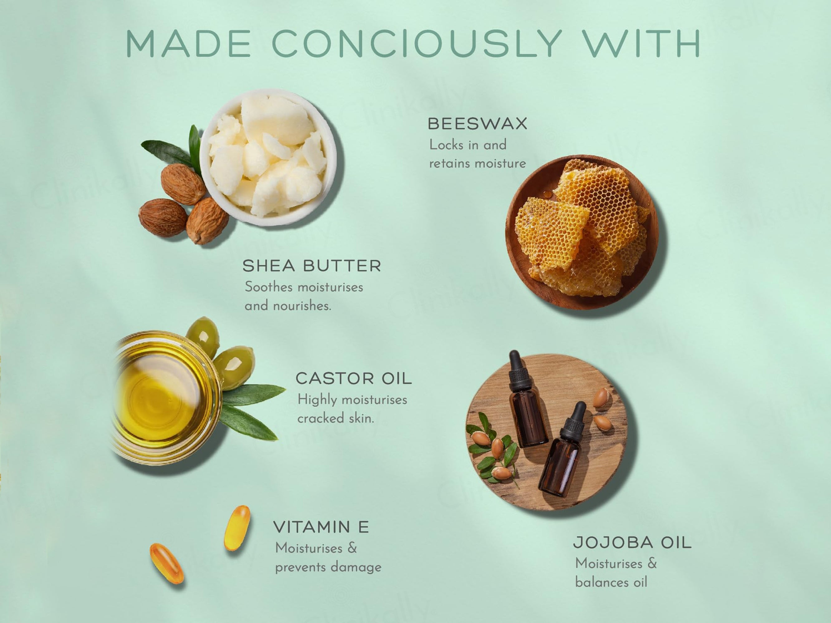 Key ingredients include castor oil, shea butter, beeswax, jojoba oil, and vitamin E.