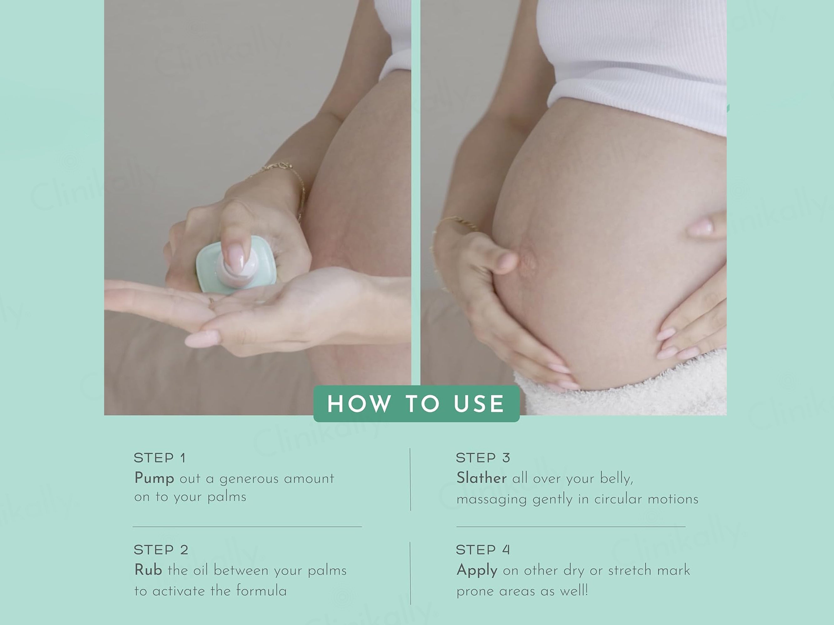 Pump onto palms, rub, and massage onto belly and stretch mark areas.
