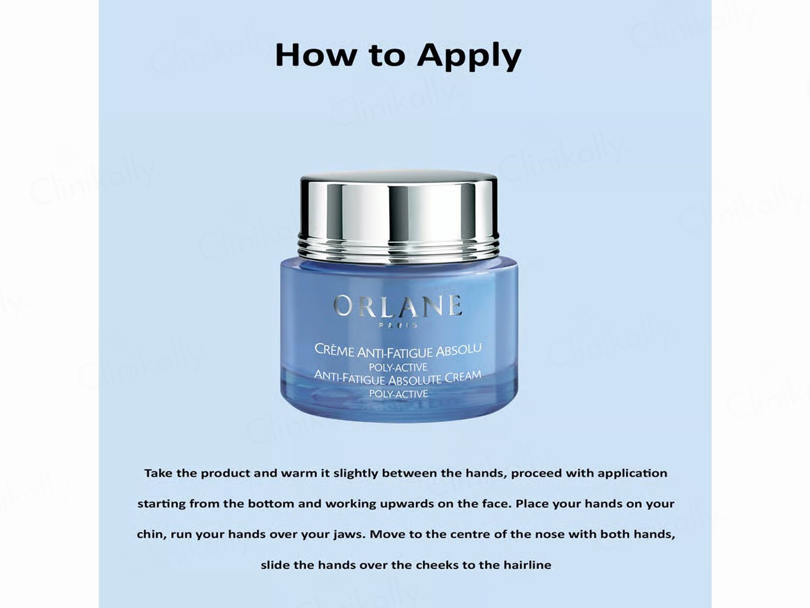 - Apply Orlane Paris Anti-Fatigue Absolute Poly-Active Cream morning and evening to the face and neck using gentle upward smoothing motions until fully absorbed.