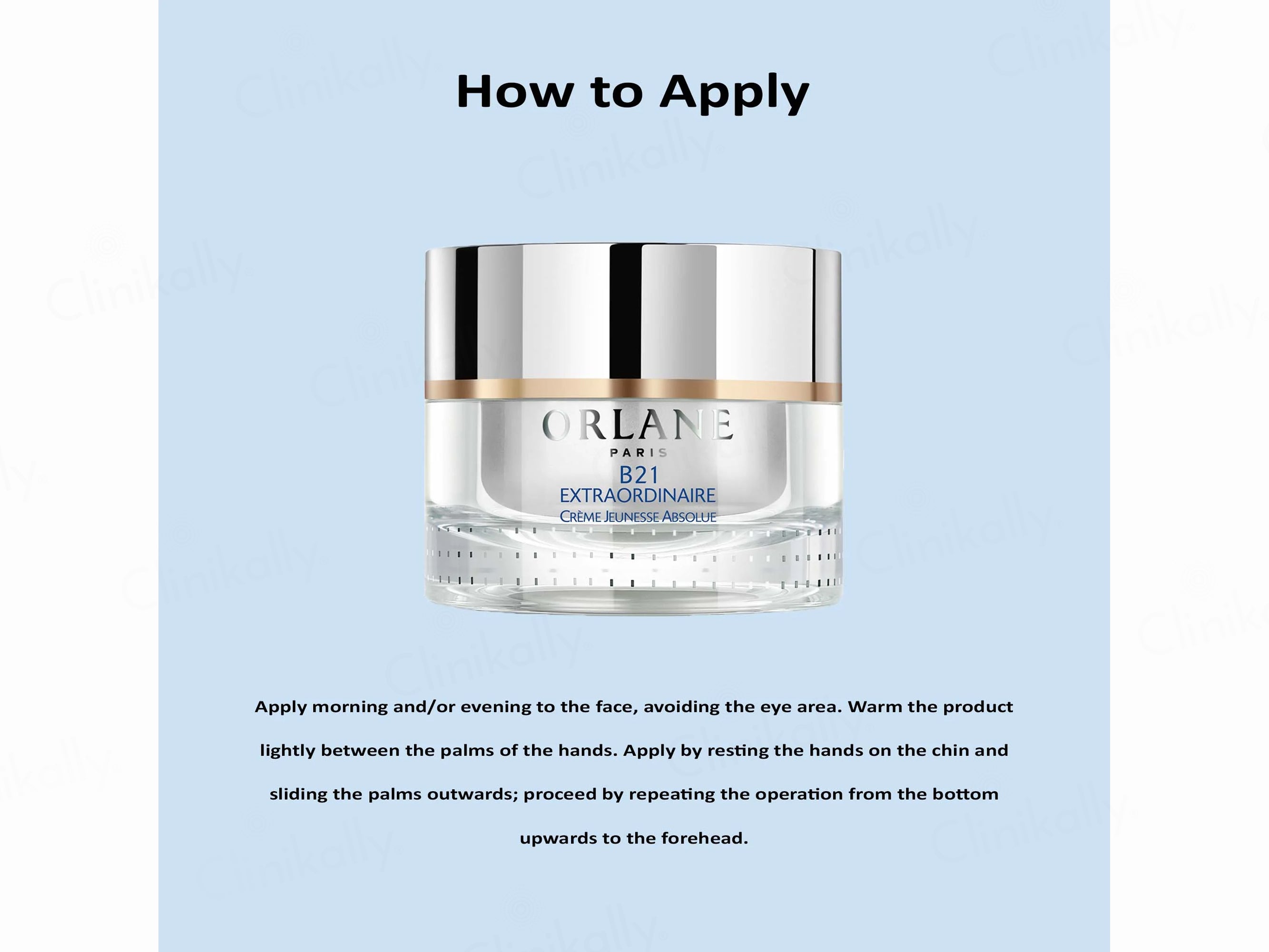 - Apply Orlane Paris B21 Extraordinaire Absolute Youth Cream morning and evening to the face and neck using gentle upward smoothing motions, preferably after the B21 Extraordinaire Youth Reset Serum for enhanced results.