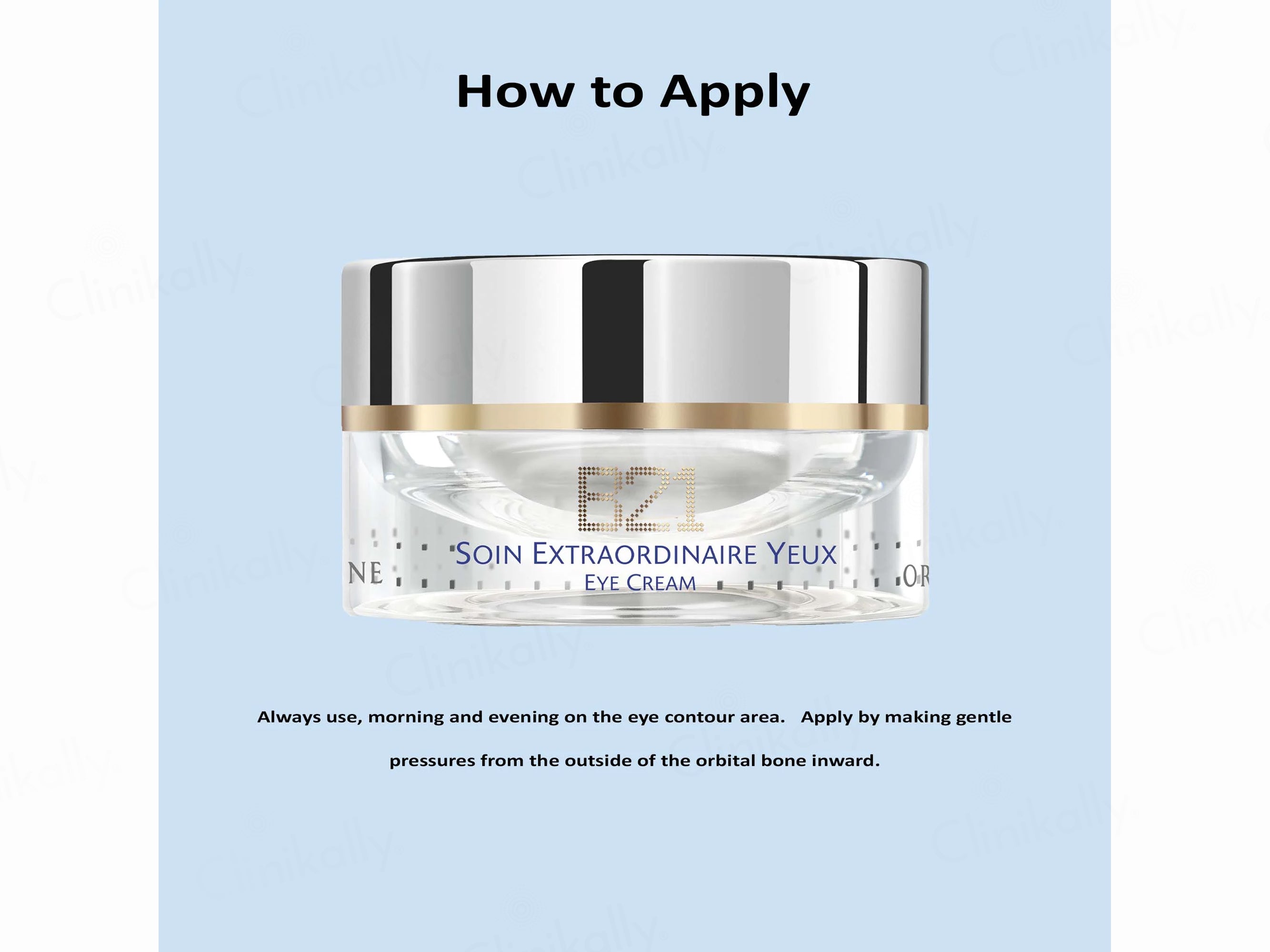 • Apply Orlane Paris B21 Extraordinaire Youth Eye Contour Cream morning and evening to the eye contour using gentle pressing movements from the outer orbital bone inward until fully absorbed.