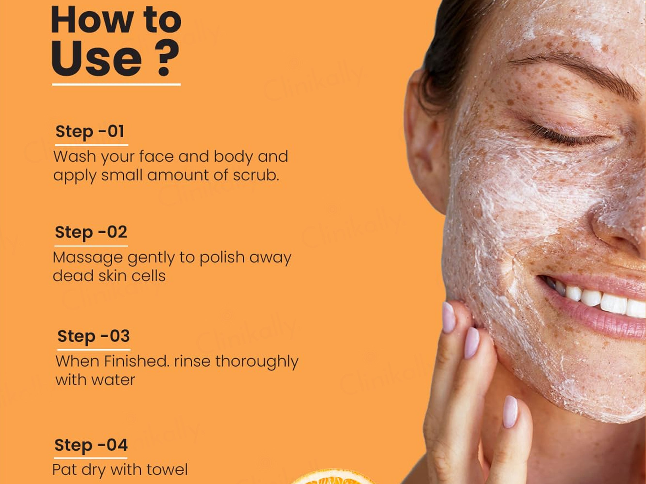 - Wash face with Oxyglow Vitamin C Face Wash, pat dry with towel; apply thin layer of Oxyglow Vitamin C Face Scrub on face and neck, gently massage in small circular motions for 1-2 minutes, rinse with lukewarm or normal tap water, pat dry with clean towel—avoid eye contact and area around eyes; use 2-3 times weekly.