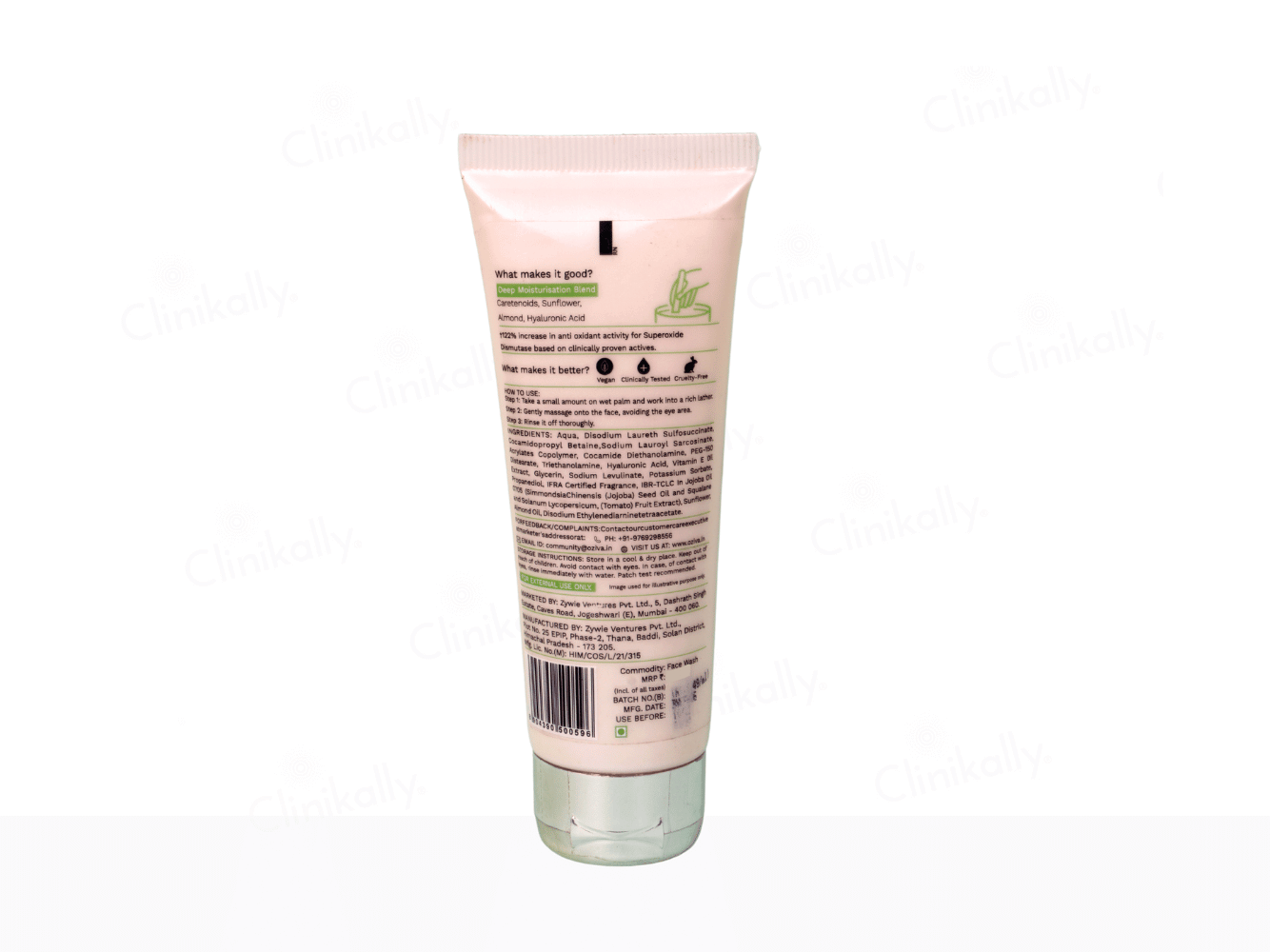 OZiva Bioactive Vitamin E122 Gel Face Wash contains Carotenoids that boost antioxidant capacity, along with Hyaluronic Acid for hydration, and Sunflower for anti-aging benefits.
