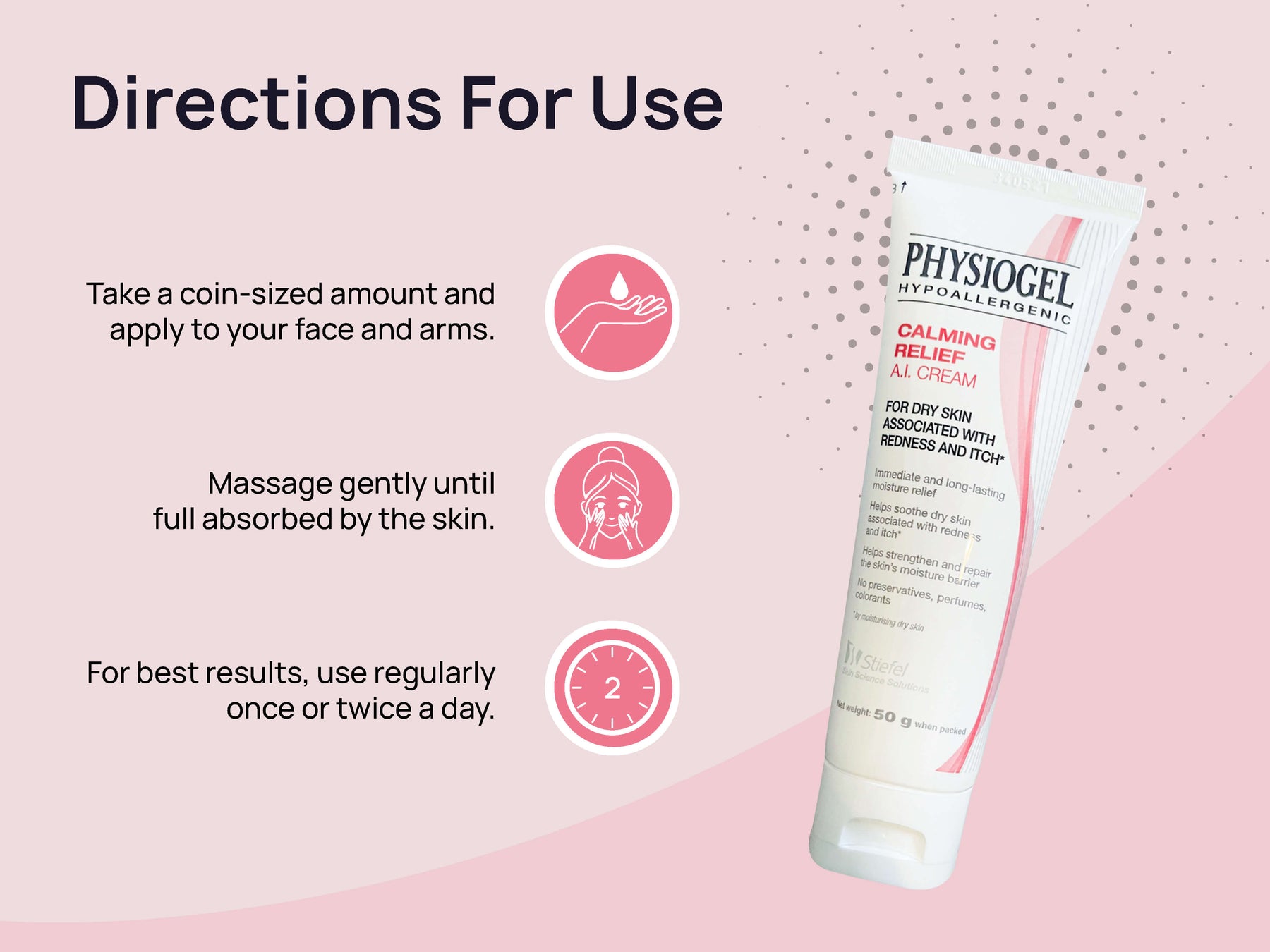 • Take a coin-sized amount and apply to your face and arms.