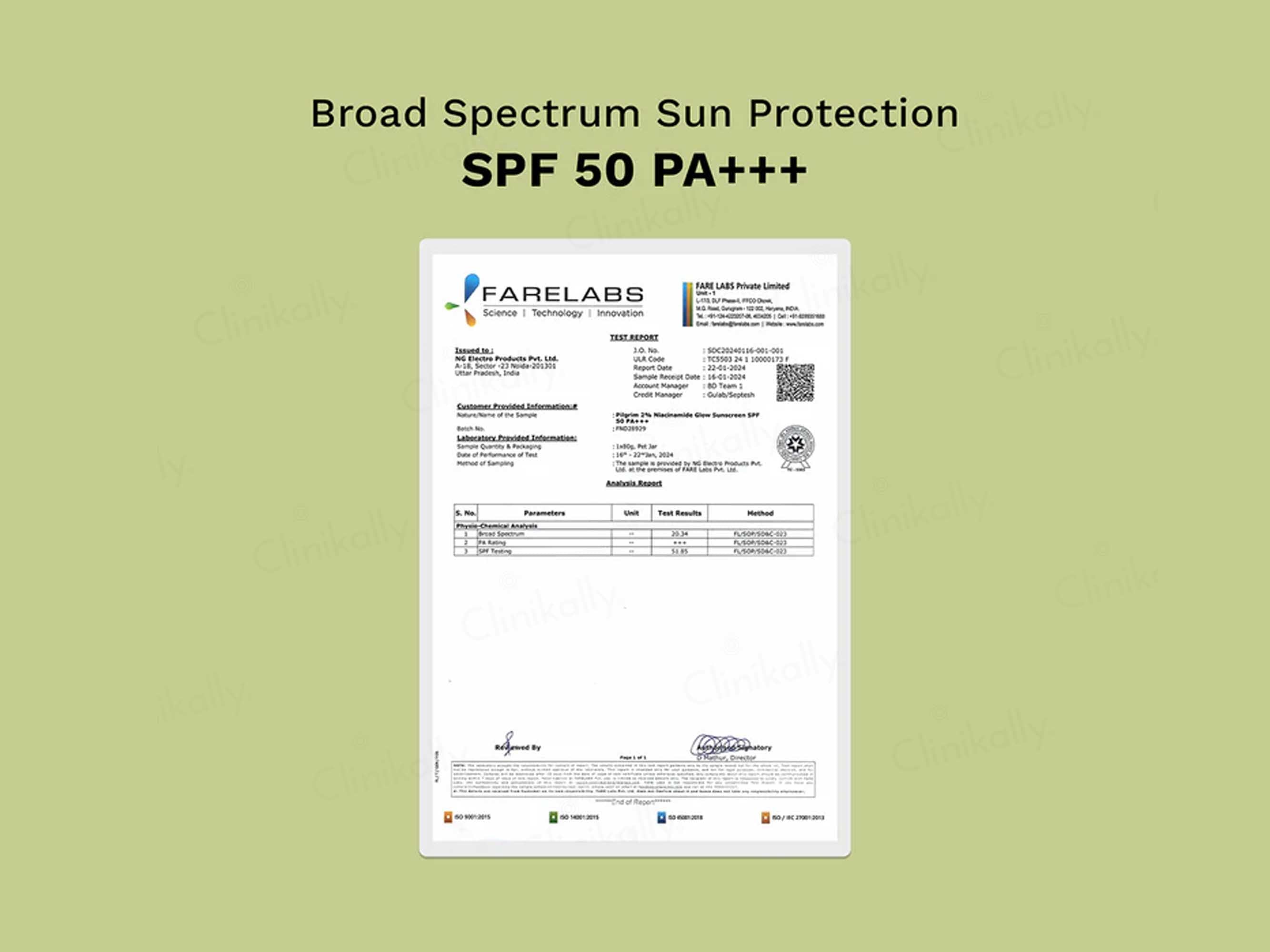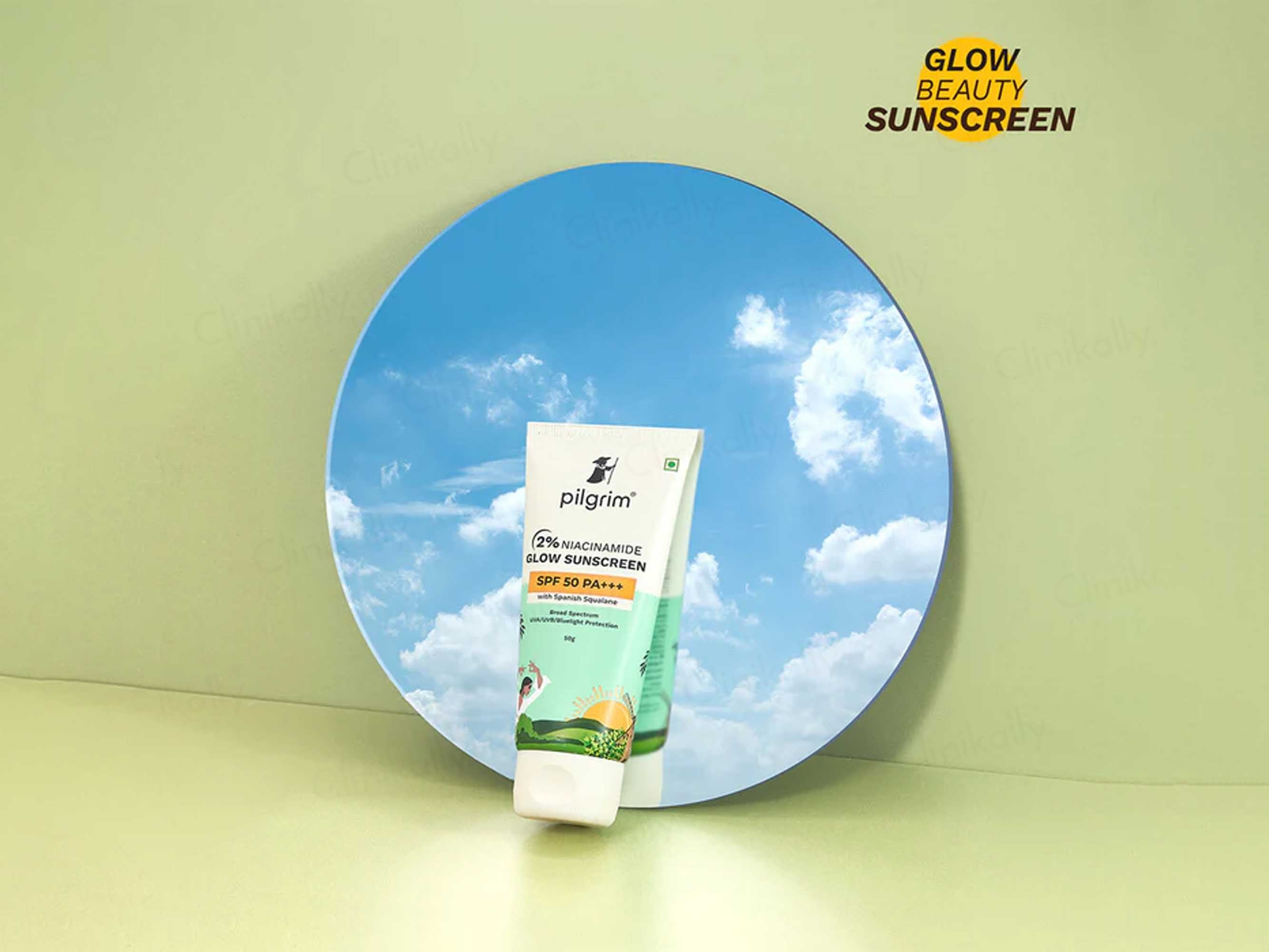 - Apply a generous amount of Pilgrim 2% Niacinamide Glow Sunscreen SPF 50 PA+++ to your face and neck after your skincare routine.