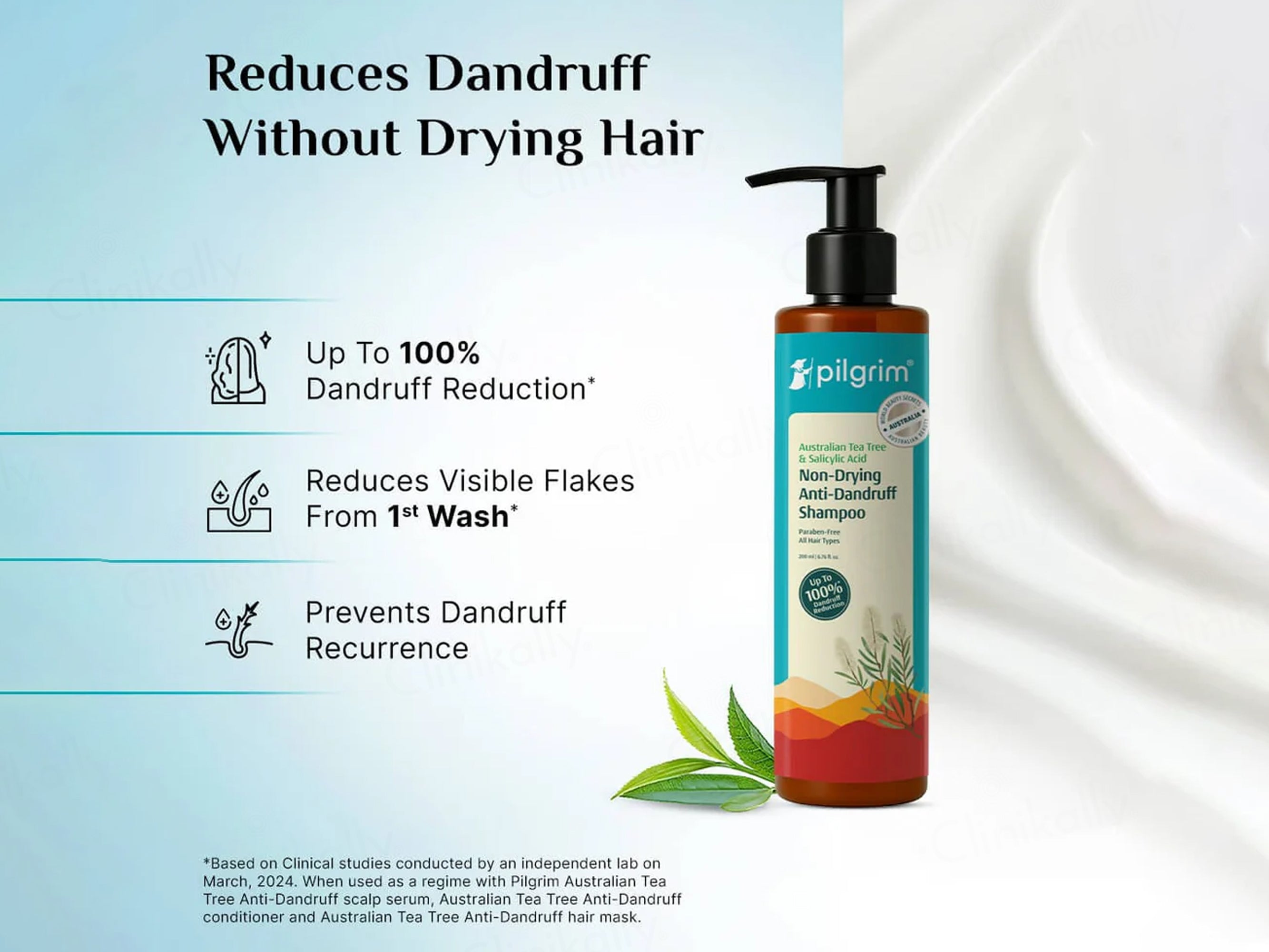 - Apply a small amount of Pilgrim Australian Tea Tree & Salicylic Acid Non-Drying Anti-Dandruff Shampoo to wet hair, massage gently into the scalp to form lather, leave on for 2–3 minutes, and rinse thoroughly; use regularly for best results.