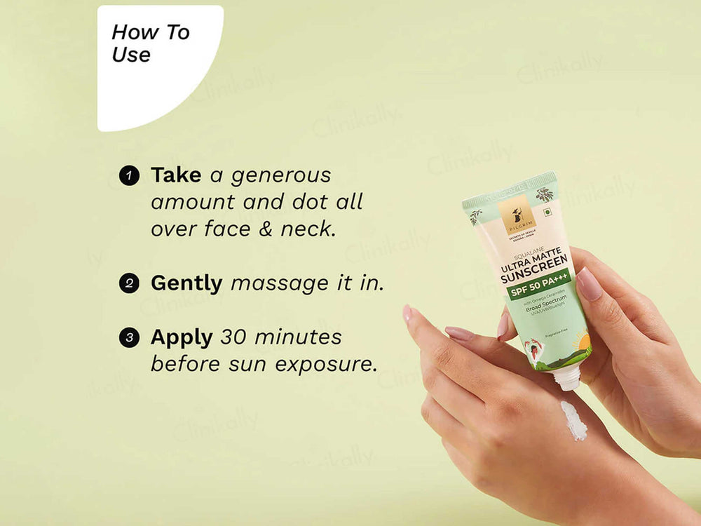 - Apply a generous amount of Pilgrim Squalane Ultra Matte Sunscreen SPF 50 PA+++ to your face and neck after your skincare routine.
